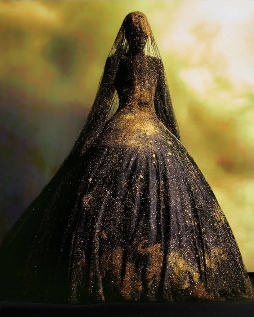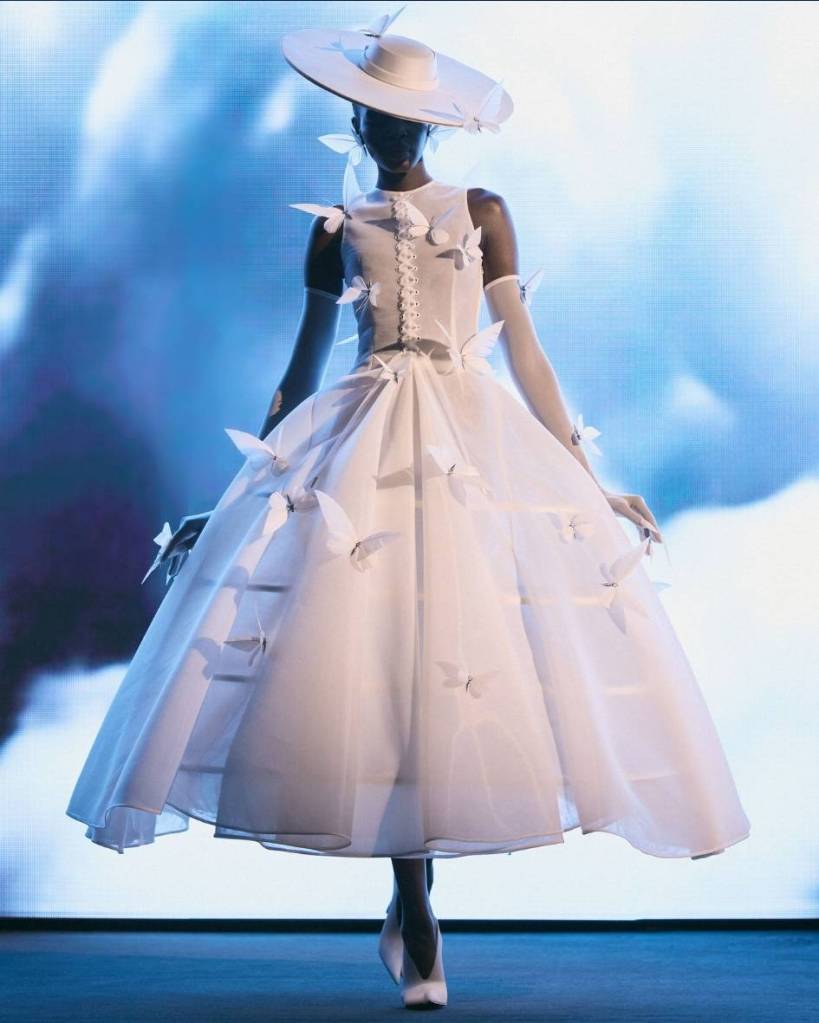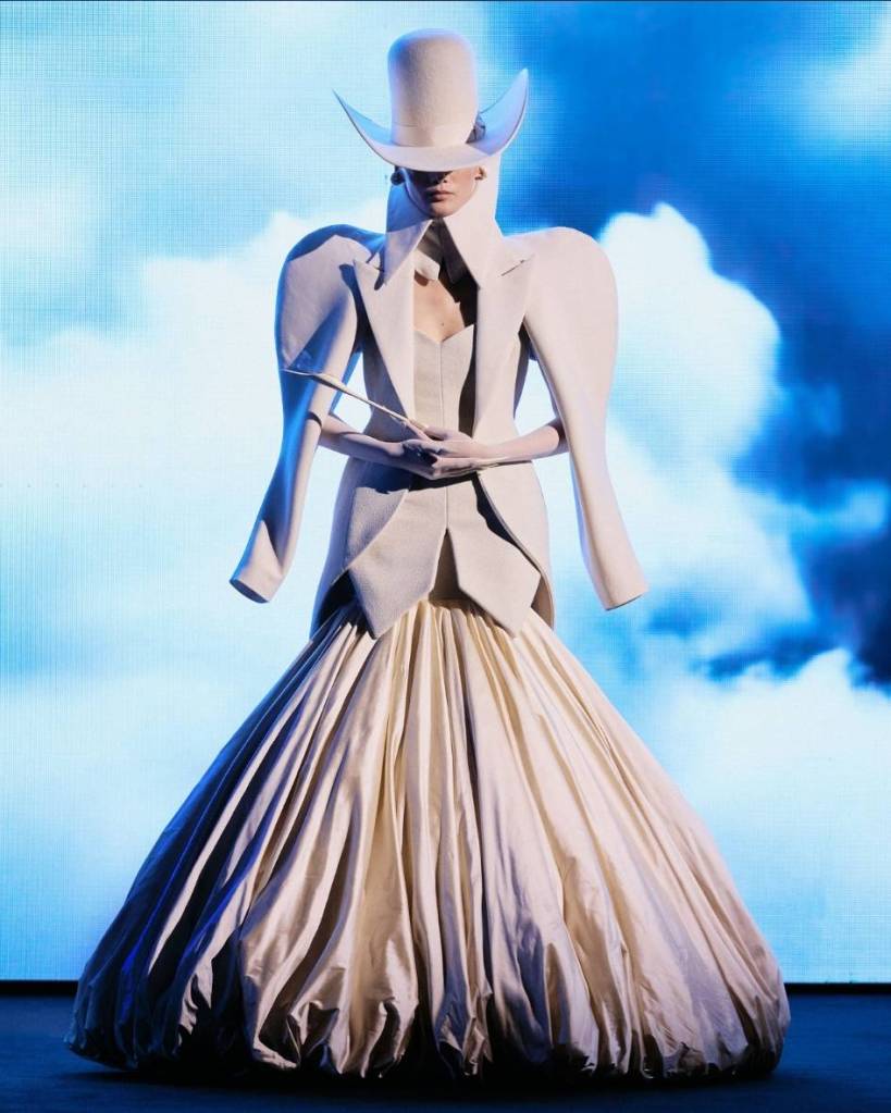 The collection moved in three acts and honestly, it felt like therapy in couture form. The opening chapter, Library, was all black and white and surprisingly restrained for a designer who loves excess. Sculpted silhouettes, sharp contours, rounded bolero shoulders, flared skirts. It was controlled, thoughtful, almost studious. Then came the dress. A massive circular gown encrusted with micro glass beads and weighing roughly as much as a grown human. The model carried it like it was nothing, which felt like the most accurate metaphor for couture I have seen all season.