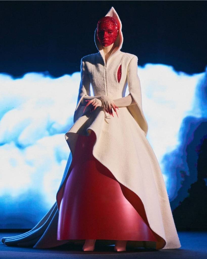 Luxury followed, and this is where Wun really leaned into discomfort. Molded bodices resembling jewellery display stands, crystal face masks that erased identity, sharp corsetry and trailing skirts. It was beautiful, intimidating, and slightly unhinged in the best way. Luxury here was not aspirational. It was confrontational. You want this. Can you survive it.