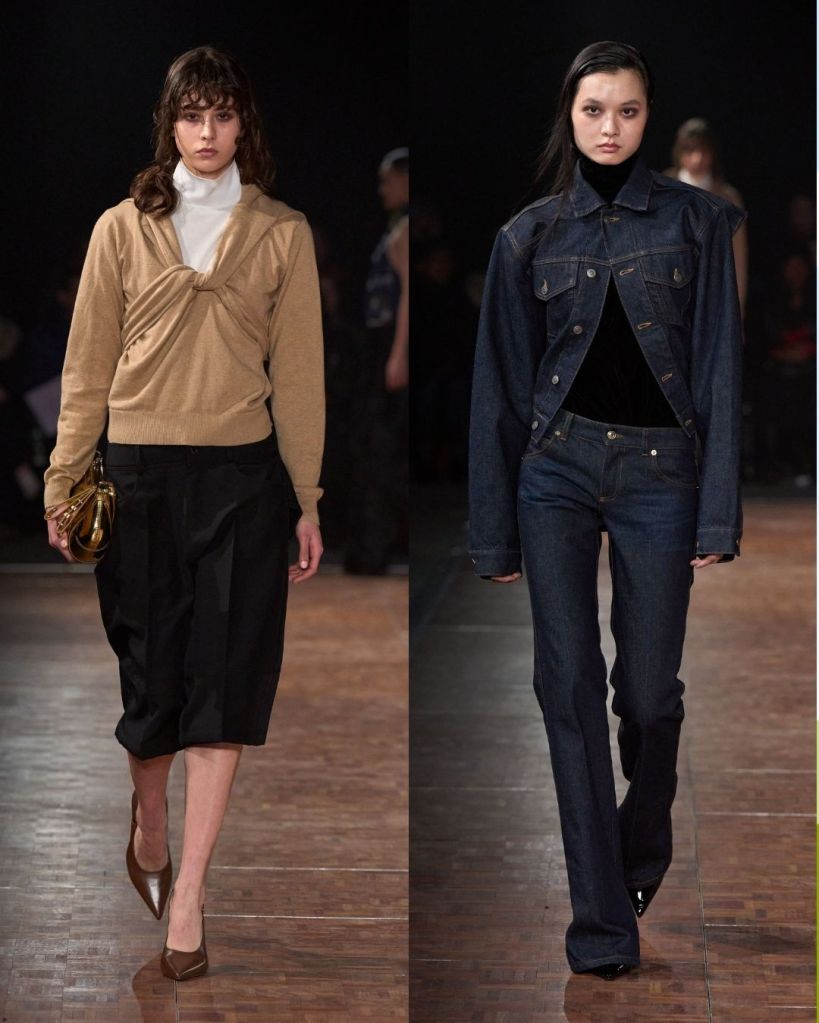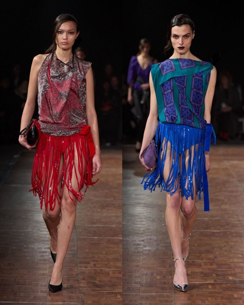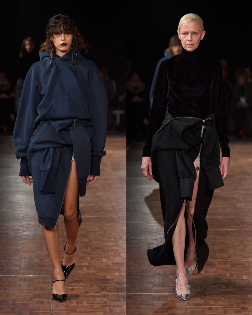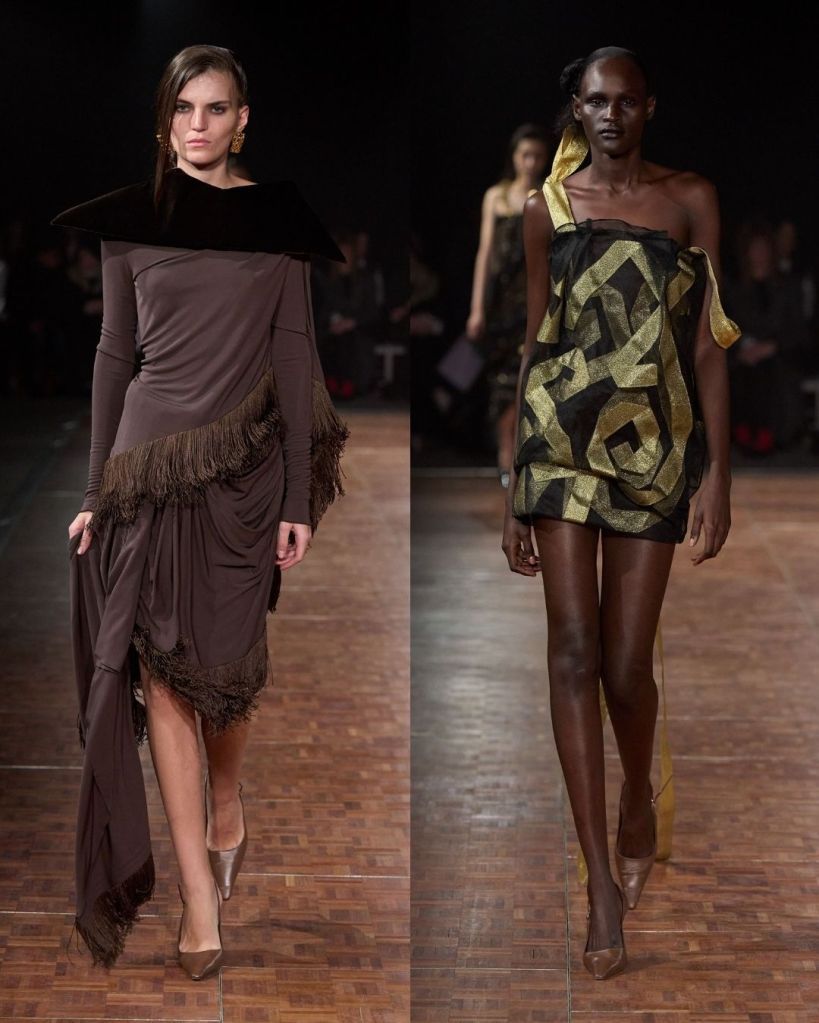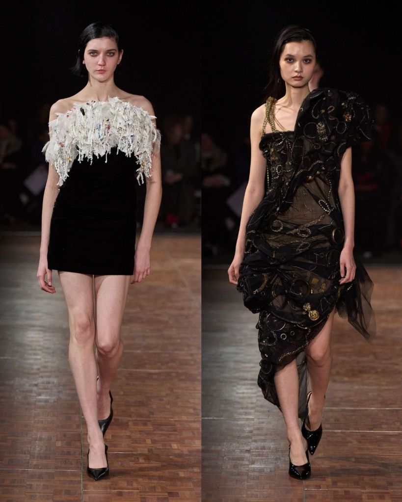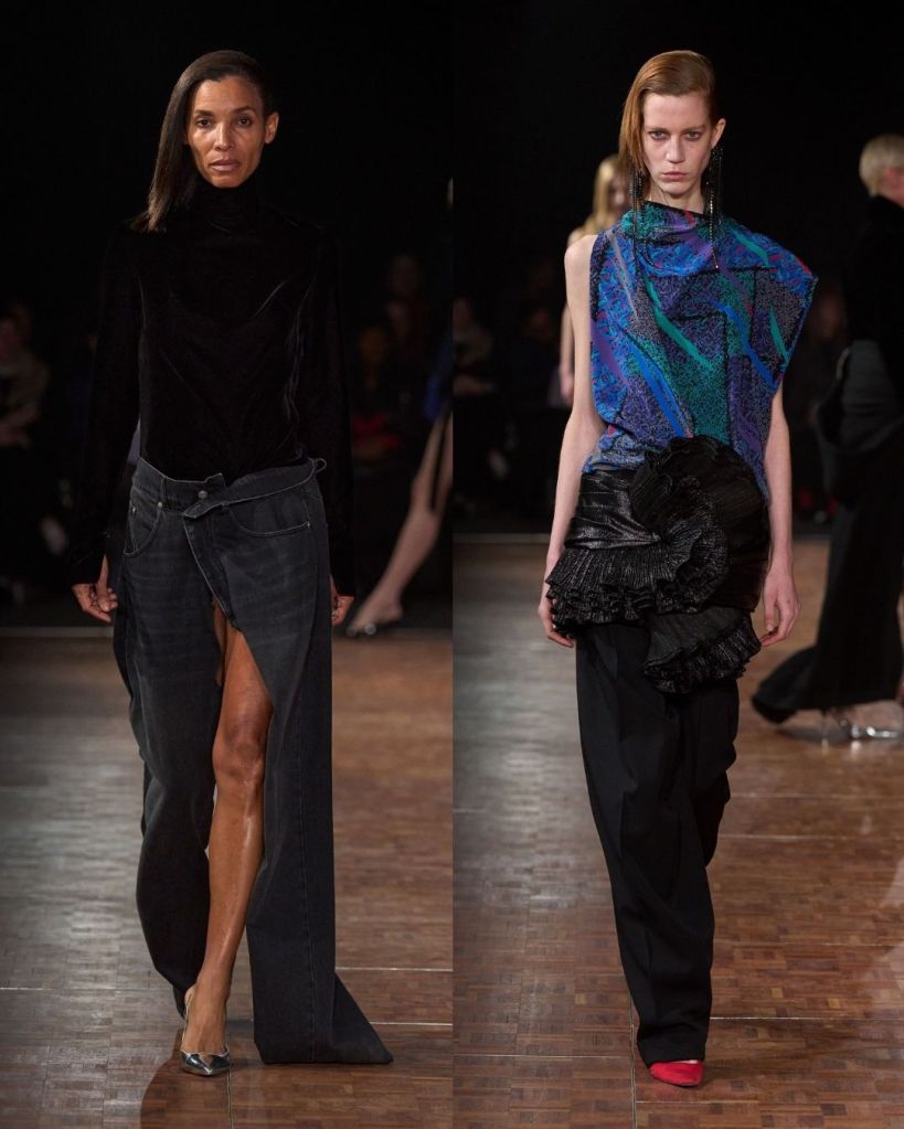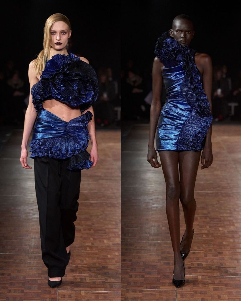 Aburn’s concept centered on glamour as a form of personal power. He explored the idea of dressing as a way to claim space and confidence. That translated into a high-low mix of pieces, from twisted denim minis and oversized belted jackets to sculptural party dresses. There were clever ideas, like vintage silk scarves reworked into draped tops and hoodies transformed into dresses. Oversized tailoring added volume and presence, while jewel toned lamé dresses with ruching nodded to 1980s eveningwear.