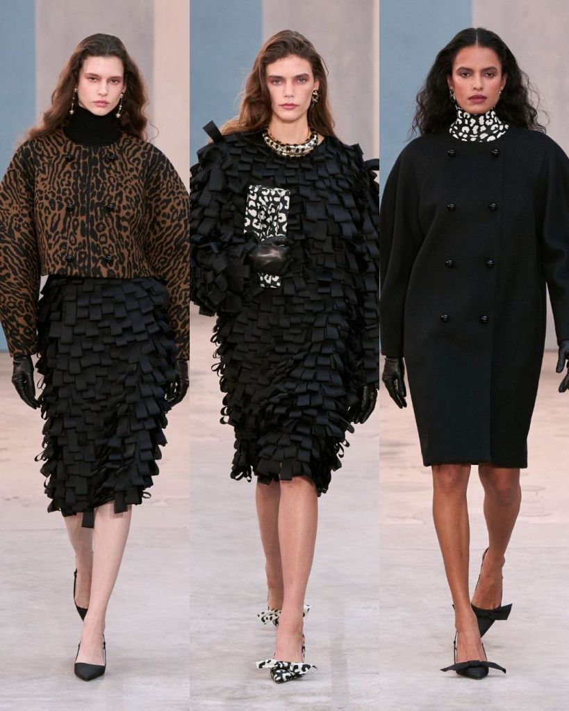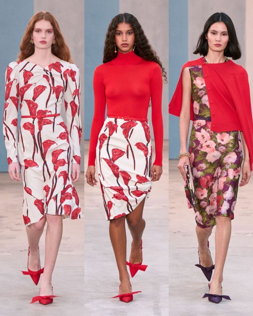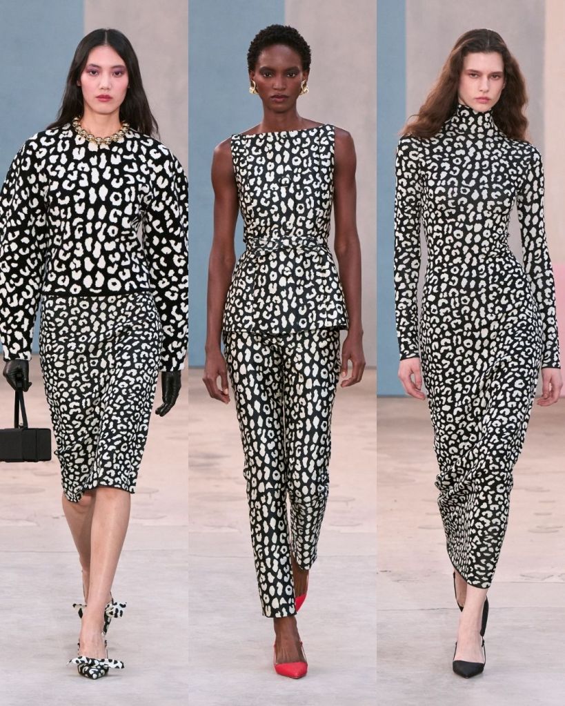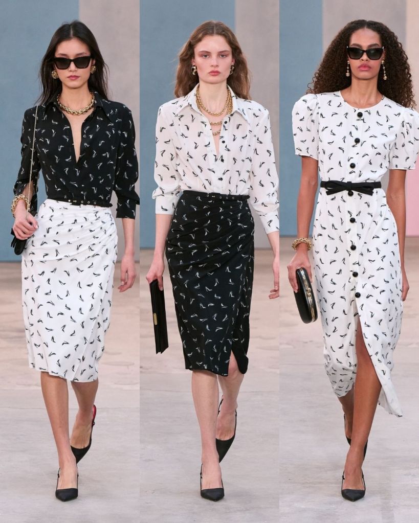 The collection leaned heavily into wardrobe separates, with sculpted jackets, pencil skirts, and printed blouses forming the foundation. One standout was a black suit decorated with colorful flowers, which captured that balance between discipline and play. Animal prints, calla lily details, and soft sketches of stiletto heels added subtle visual interest without overwhelming the clothes.