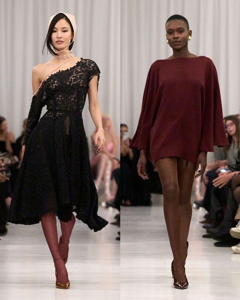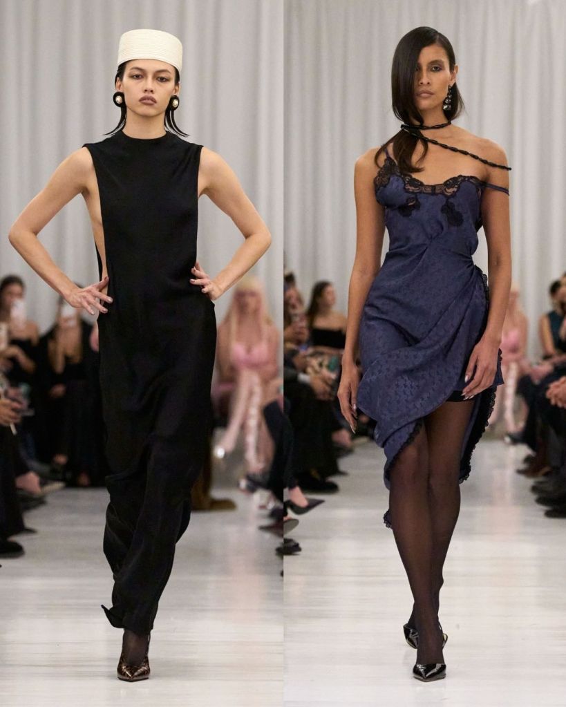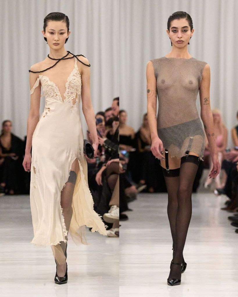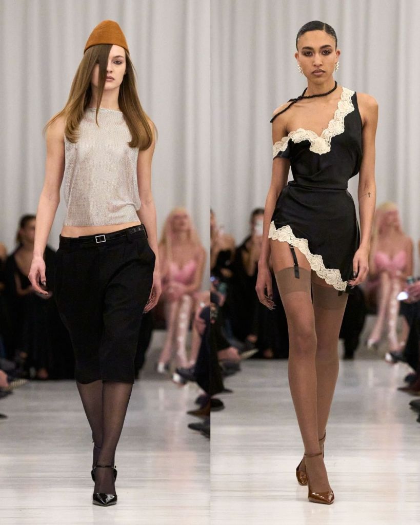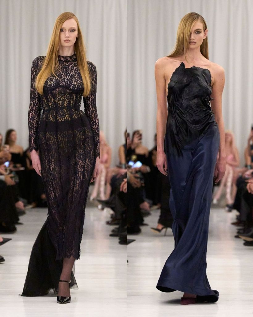 The collection explored the private moments of getting dressed, drawing from Hollywood starlets of the 1920s through the 1950s. Cowan used archival lace, vintage lingerie, and delicate silks, reworking them into modern silhouettes. Bullet bras, garter belts, and corsetry were no longer hidden but became central to the look. Pieces like disheveled lace slips, liquid silk gowns that clung closely to the body, and fur-trimmed jackets created a balance between vulnerability and control. The sensuality was clear, but it never felt excessive or forced.
