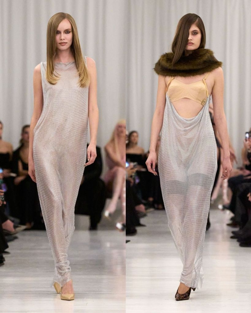 What stood out most was how the collection played with contrast. Structured tailoring appeared alongside fragile fabrics. Low-slung trousers grounded sheer, delicate tops. Even the gel-treated silks, pressed directly onto the body, added an element of rawness and experimentation. It all felt intentional, like Cowan was rethinking glamour in a more personal and human way.