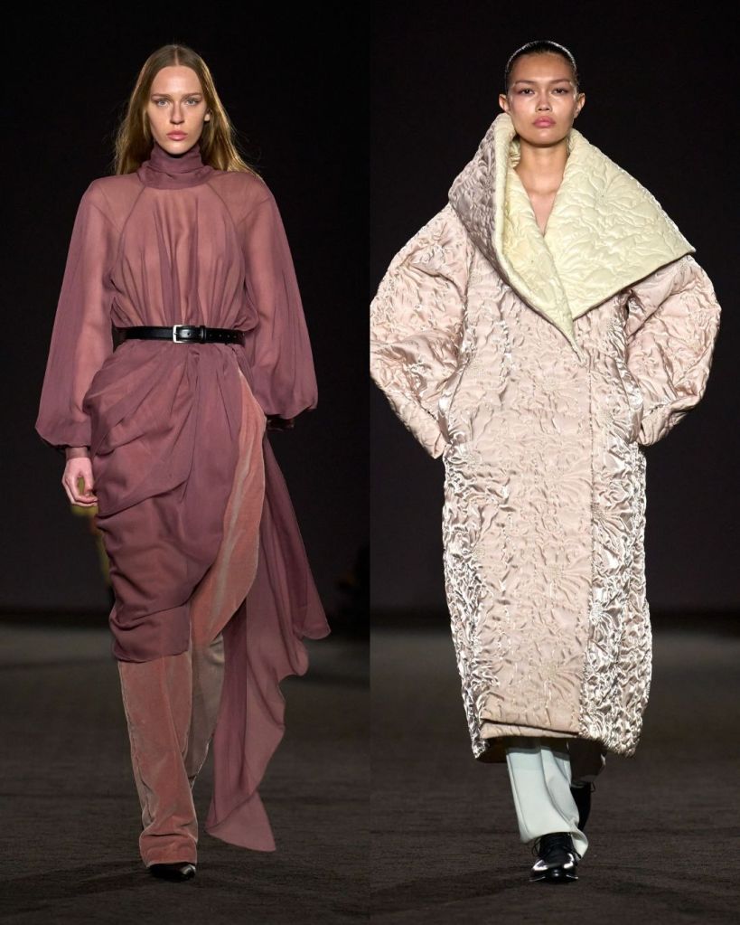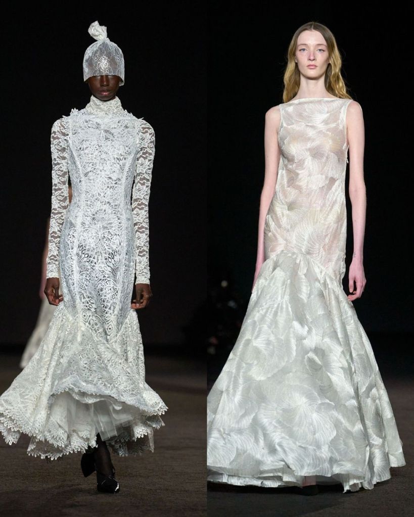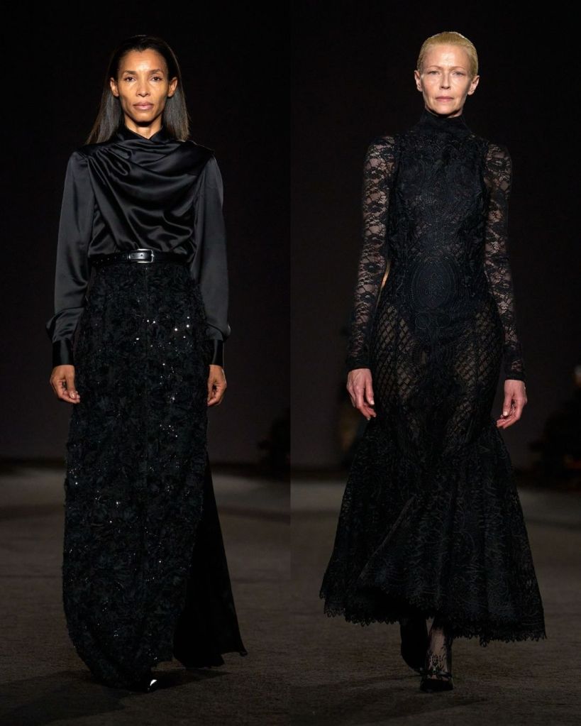 The show opened with suiting, which immediately set the tone. Black and white tailored looks referenced Gurung’s Catholic school uniform, but they were softened with drape, lace trims, and subtle embroidery. These pieces felt personal but also powerful. They were structured without feeling stiff. You could sense the idea of resilience behind them. It was elegance with backbone. The coats, especially the quilted ones inspired by school duvets and nun habits, added another layer of comfort and protection. They looked rich and tactile, like pieces you would instinctively want to touch.