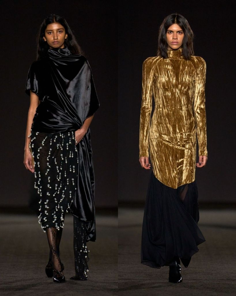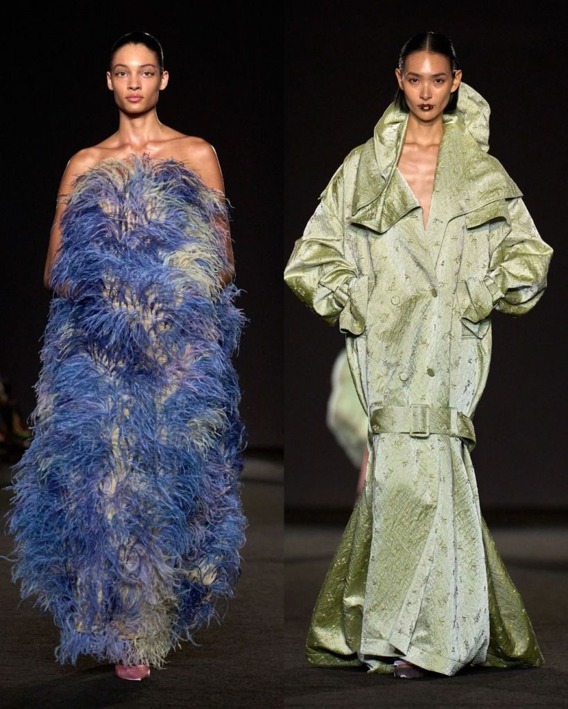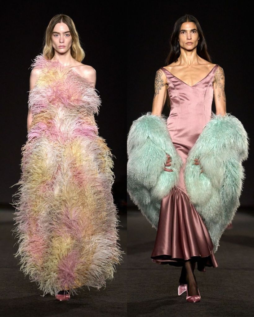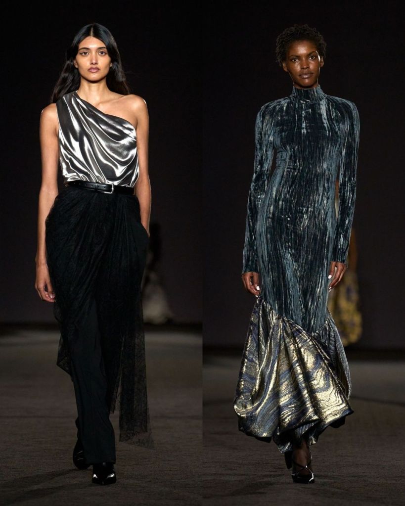 Eveningwear remained central to Gurung’s world, and here it leaned fully into glamour. Draped gowns, feathered textures, and embellishments with pearls and emerald tones brought a sense of magic. The jewel toned palette of deep plums, charcoals, and sapphires gave everything a heavier, more emotional depth. These were not carefree party dresses. They carried weight, memory, and meaning.