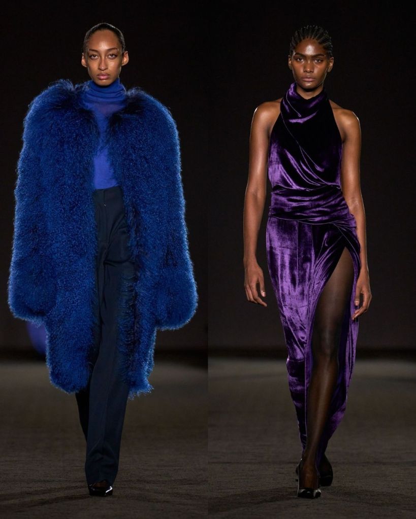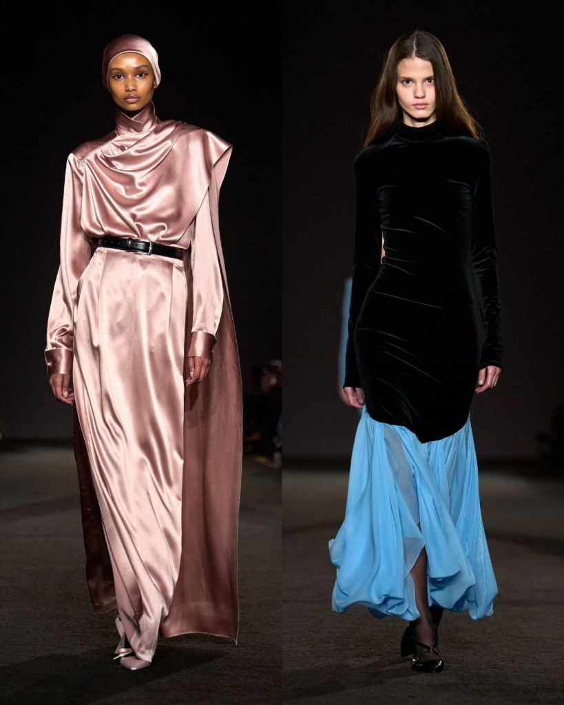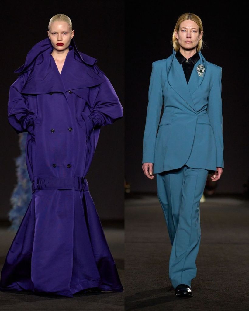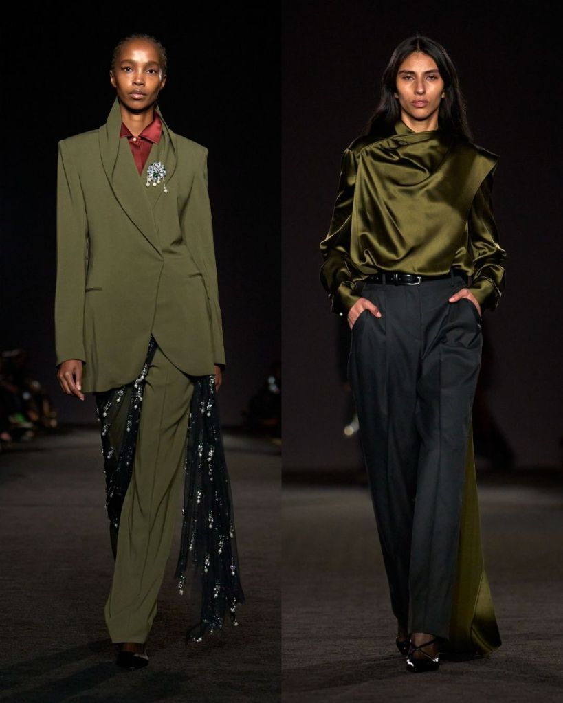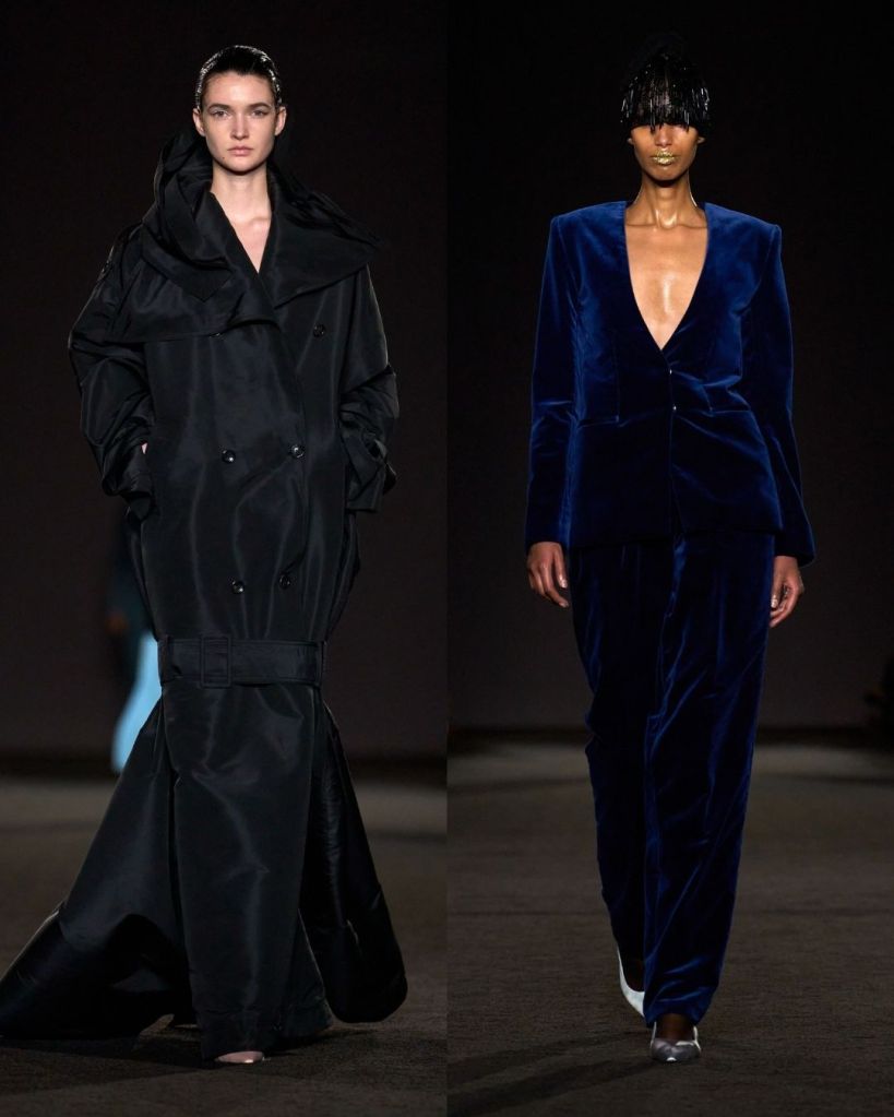 Eveningwear remained central to Gurung’s world, and here it leaned fully into glamour. Draped gowns, feathered textures, and embellishments with pearls and emerald tones brought a sense of magic. The jewel toned palette of deep plums, charcoals, and sapphires gave everything a heavier, more emotional depth. These were not carefree party dresses. They carried weight, memory, and meaning.
