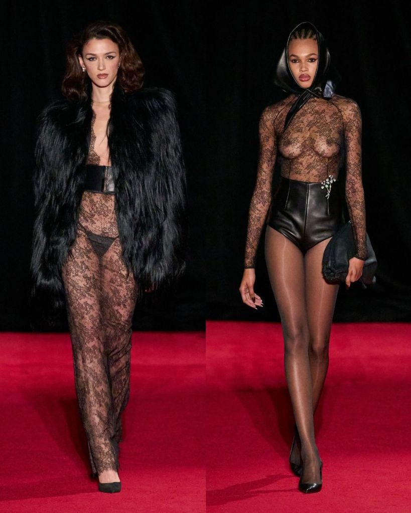 There were still moments that leaned into Smith’s more provocative instincts. Lace catsuits, exposed silhouettes, and heavily embellished pieces brought back his familiar energy, though a few of these veered into slightly gaudy territory.