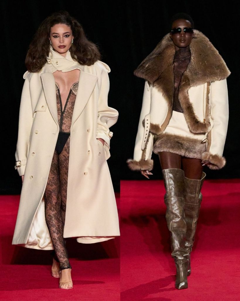 The collection opened with strong outerwear, including moto jackets reworked into short coat dresses and oversized shearling pieces that added volume and presence. Fur trims, executed through shearling, appeared throughout and gave certain looks a sense of drama. Some of these moments worked well, especially when balanced with cleaner silhouettes, though others leaned slightly flashy and lost some of the elegance the theme promised.