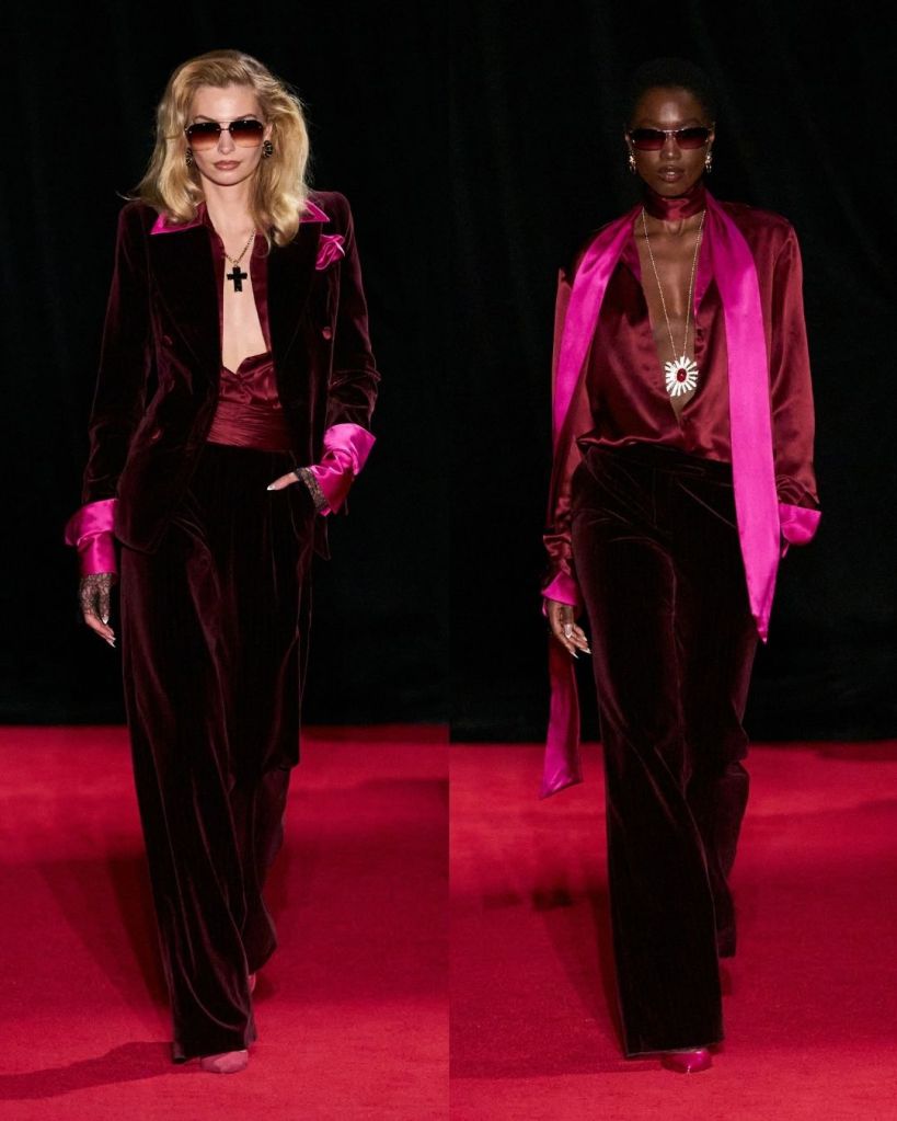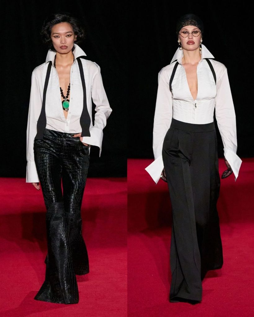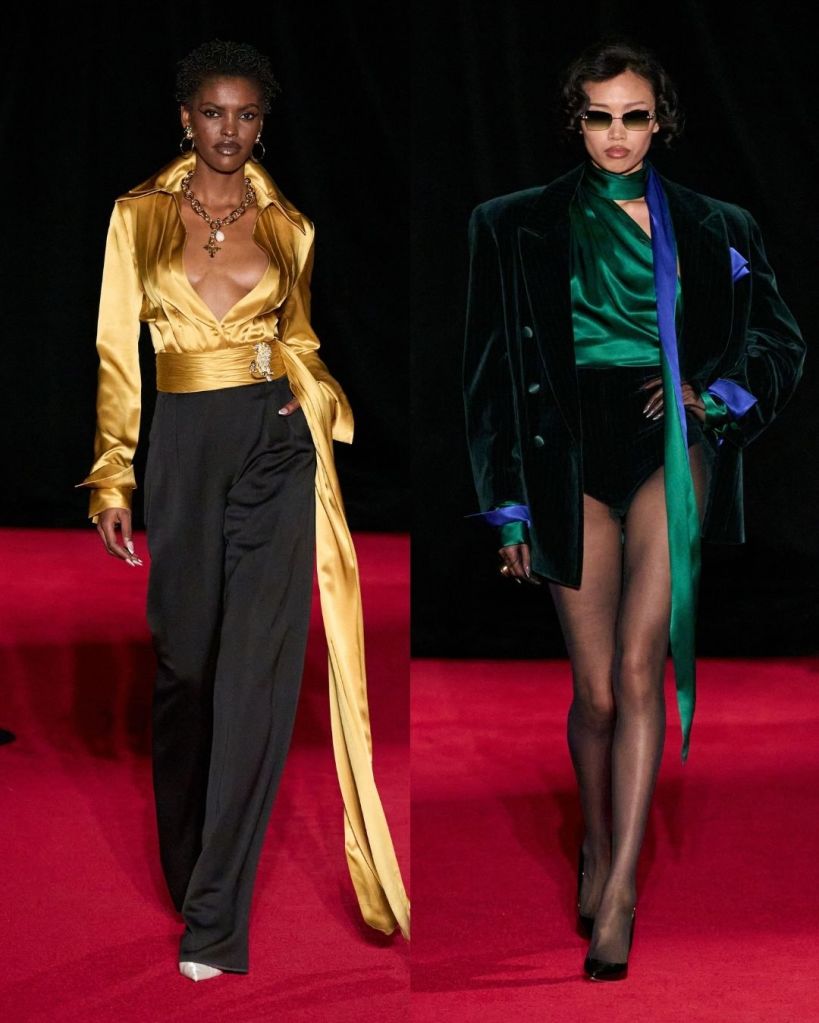 The satin tops were among the best pieces. They felt smooth, confident, and naturally sensual without needing extra embellishment. These were the moments where Smith’s strengths really showed. Tailoring also played a bigger role than usual. Velvet pinstripe suits, tuxedo-inspired shirts with built-in bow tie details, and structured jackets suggested a shift toward a more polished direction. It showed that Smith is interested in expanding beyond just nightlife dressing.