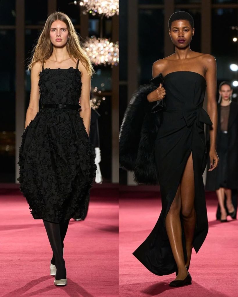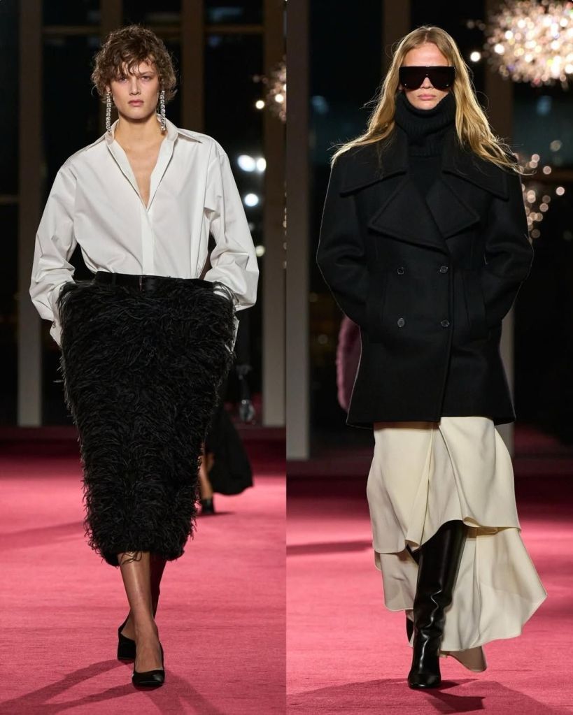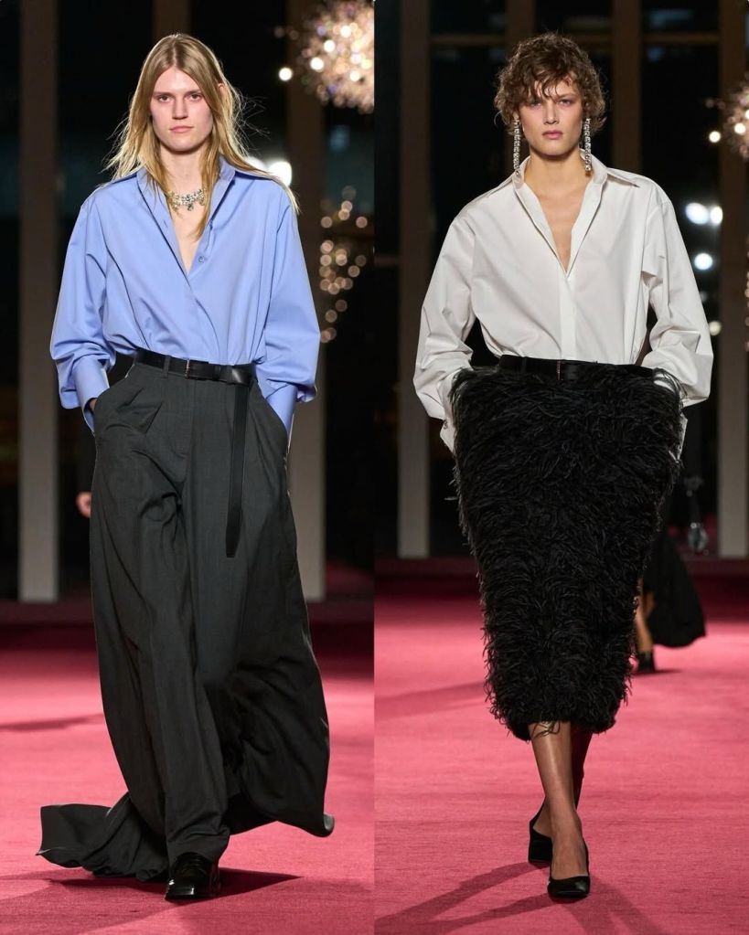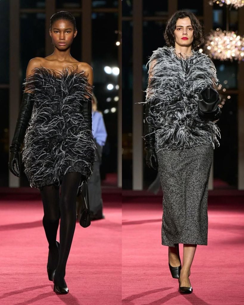 What made this collection feel fresh was the way he softened those classics. Tailored blazers moved more fluidly, sometimes extending into long, trailing panels. Trousers revealed unexpected skirt backs. Layering felt intentional but never heavy, with turtleneck dickeys creating the look of depth without bulk. Even the more glamorous elements, like feathers and paillettes, appeared on button downs, T shirts, and relaxed separates rather than traditional gowns. It made glamour feel wearable, not distant.