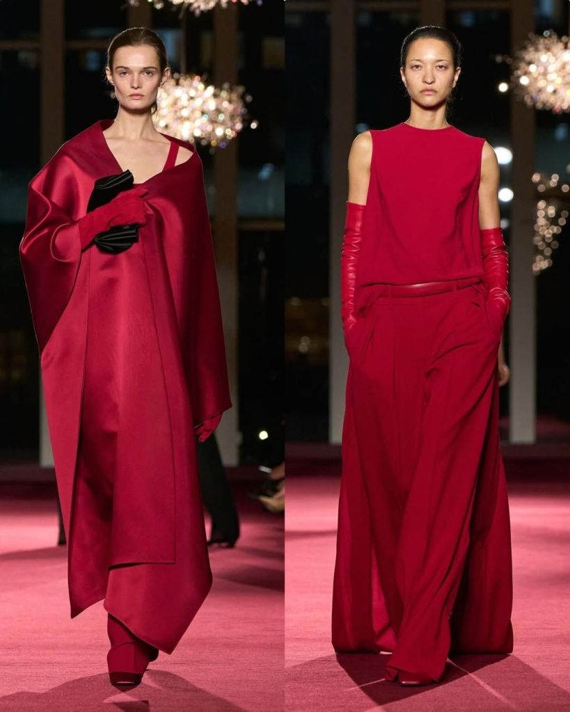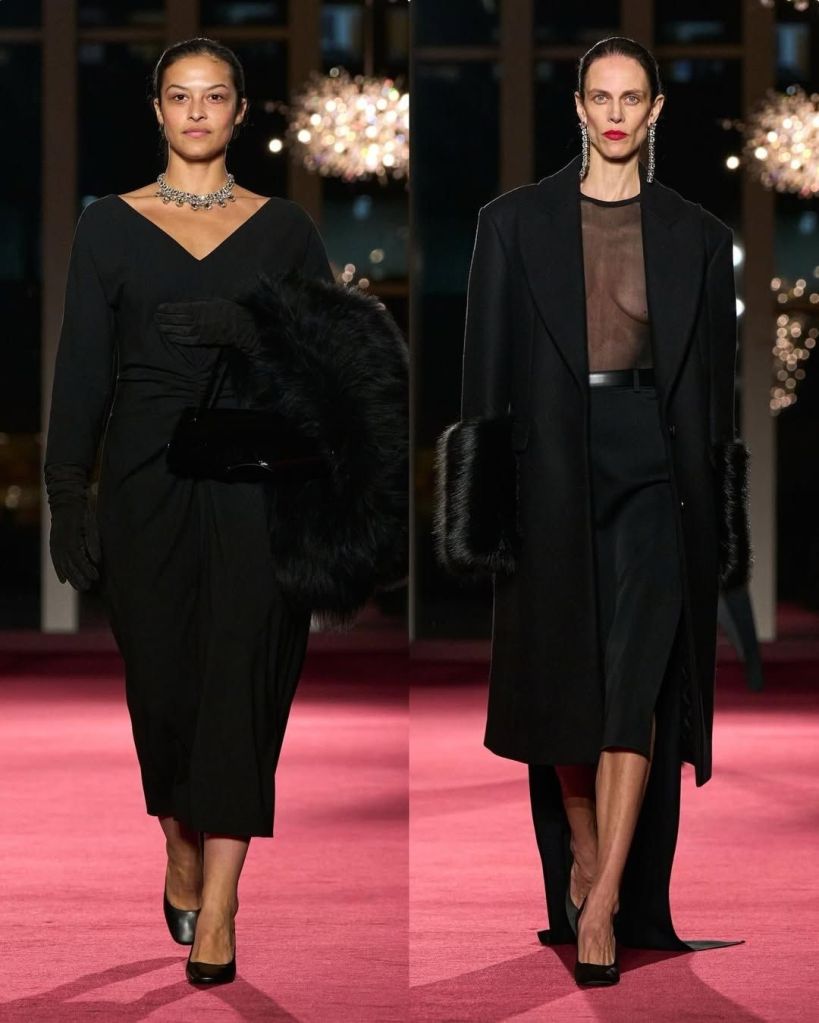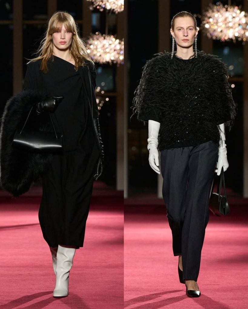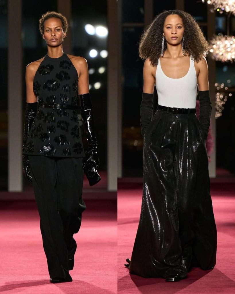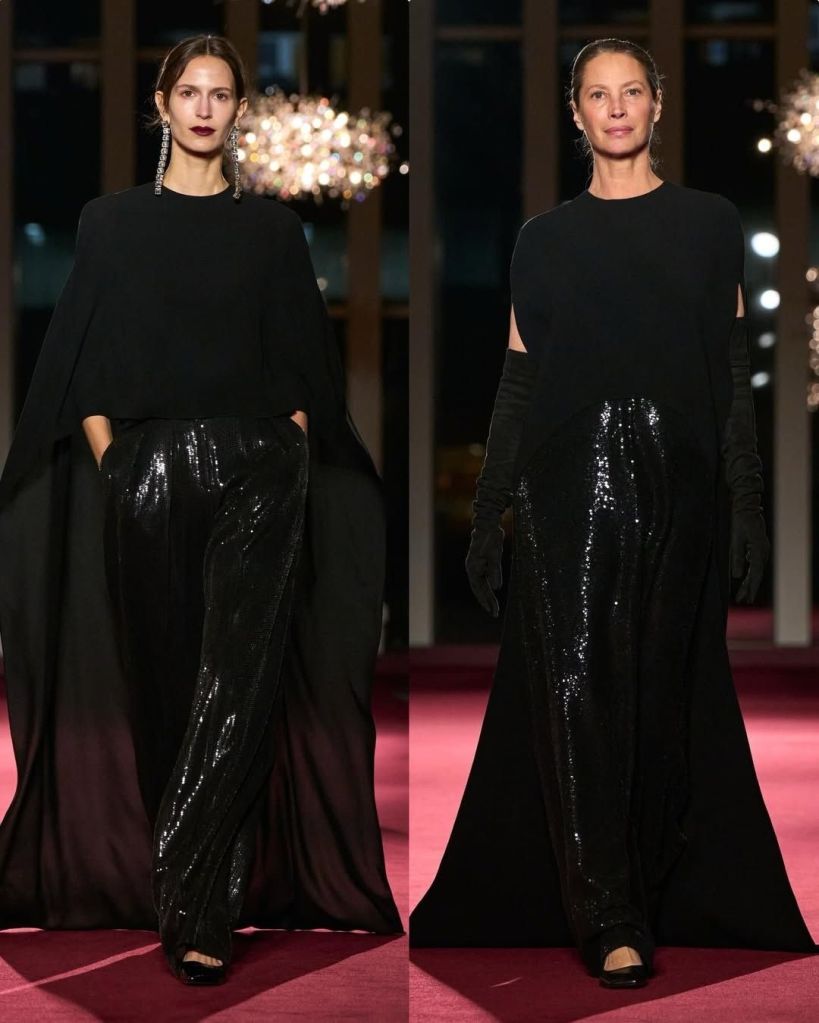 There was also a strong sense of ease. Cashmere knits, stovepipe jeans, and long coats grounded the collection in real life. Eveningwear followed the same logic. Christy Turlington closed in a black top with a train paired with shimmering trousers, proving that drama can still feel effortless.