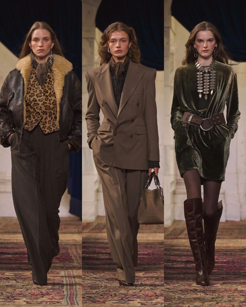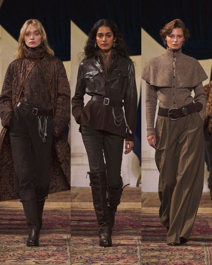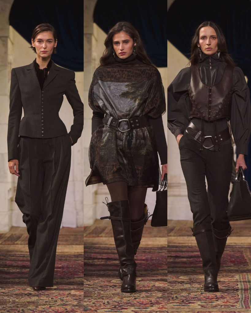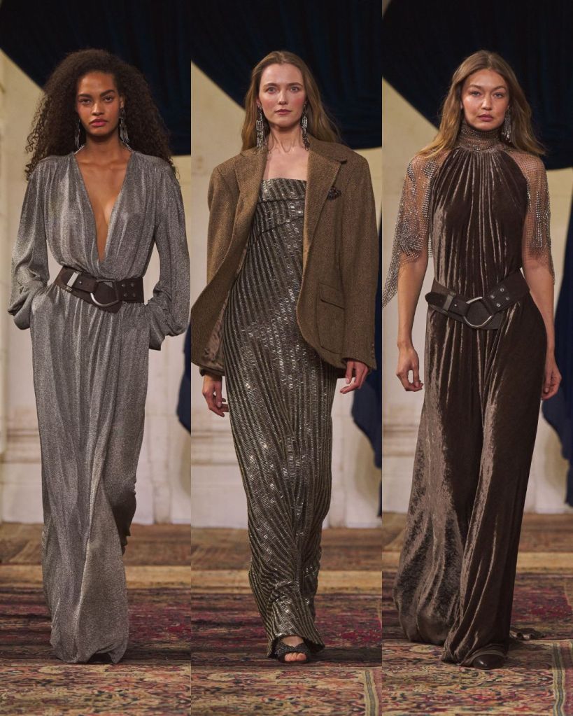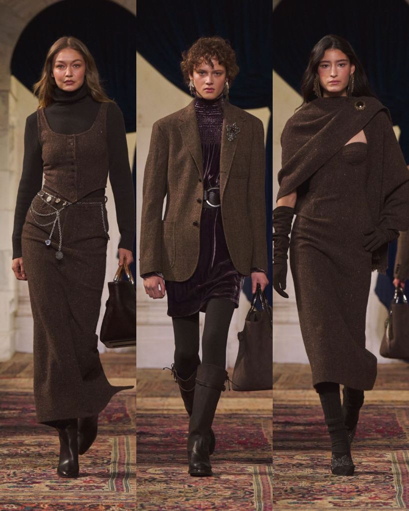 The balance was classic Lauren: riding boots anchoring sweeping skirts, a chunky toggle cardigan thrown over tailored trousers, a tweed blazer cutting through a beaded evening dress. Gigi Hadid opened in a boucle tweed corset and closed in a brown velvet halter gown cinched with a leather O ring belt, summing up the show’s duality. Strength and romance. Armor and softness. Even the medieval references felt wearable rather than theatrical.