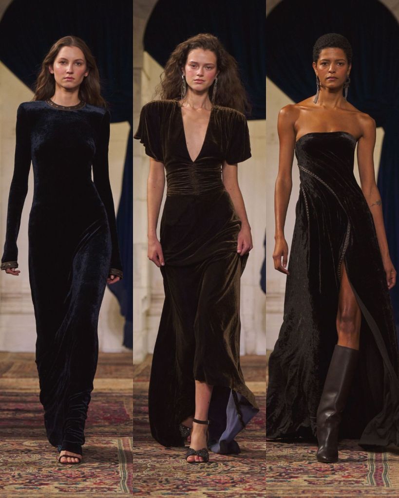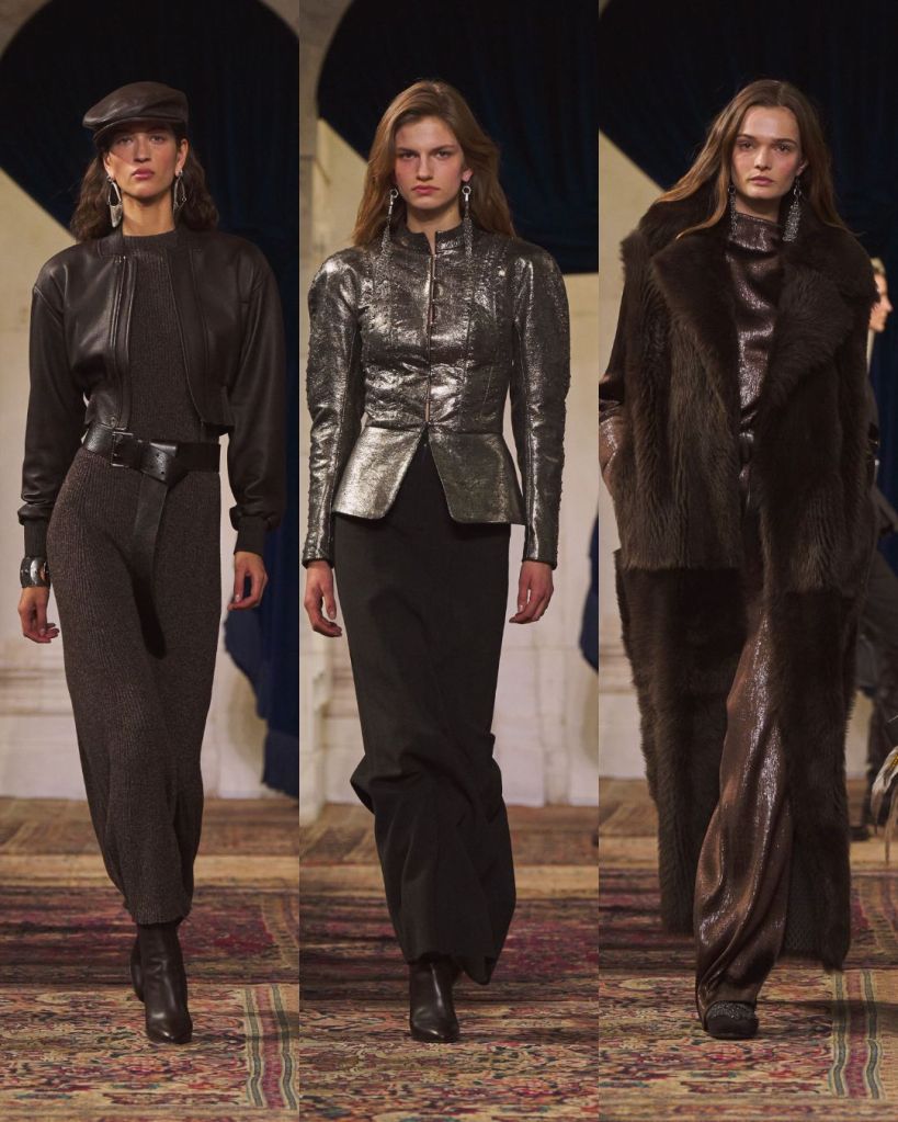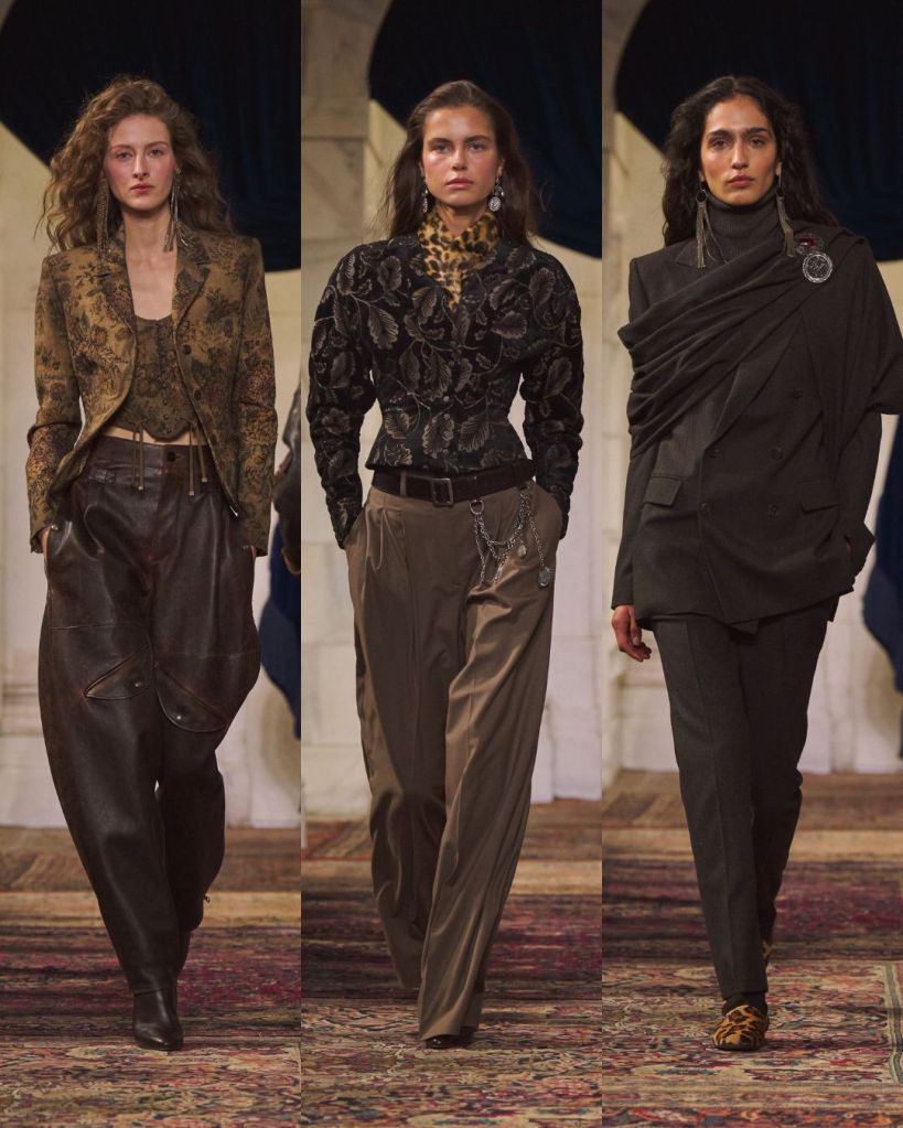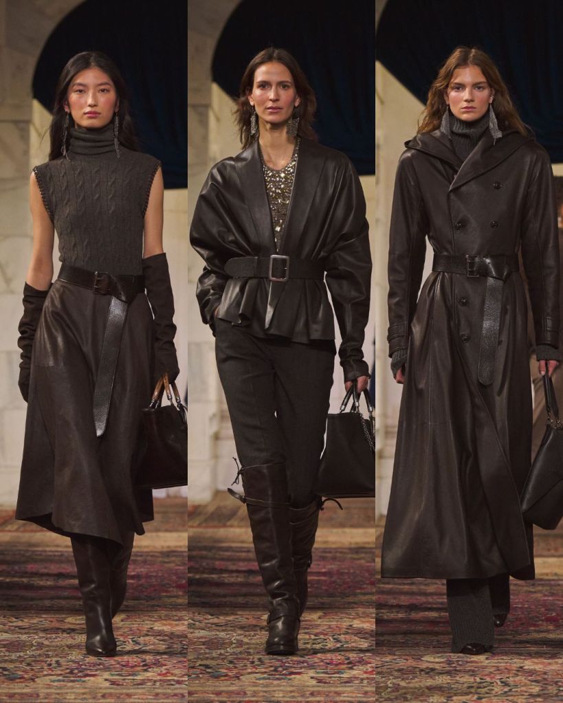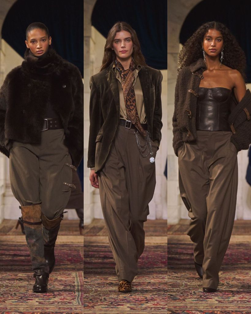 The balance was classic Lauren: riding boots anchoring sweeping skirts, a chunky toggle cardigan thrown over tailored trousers, a tweed blazer cutting through a beaded evening dress. Gigi Hadid opened in a boucle tweed corset and closed in a brown velvet halter gown cinched with a leather O ring belt, summing up the show’s duality. Strength and romance. Armor and softness. Even the medieval references felt wearable rather than theatrical.