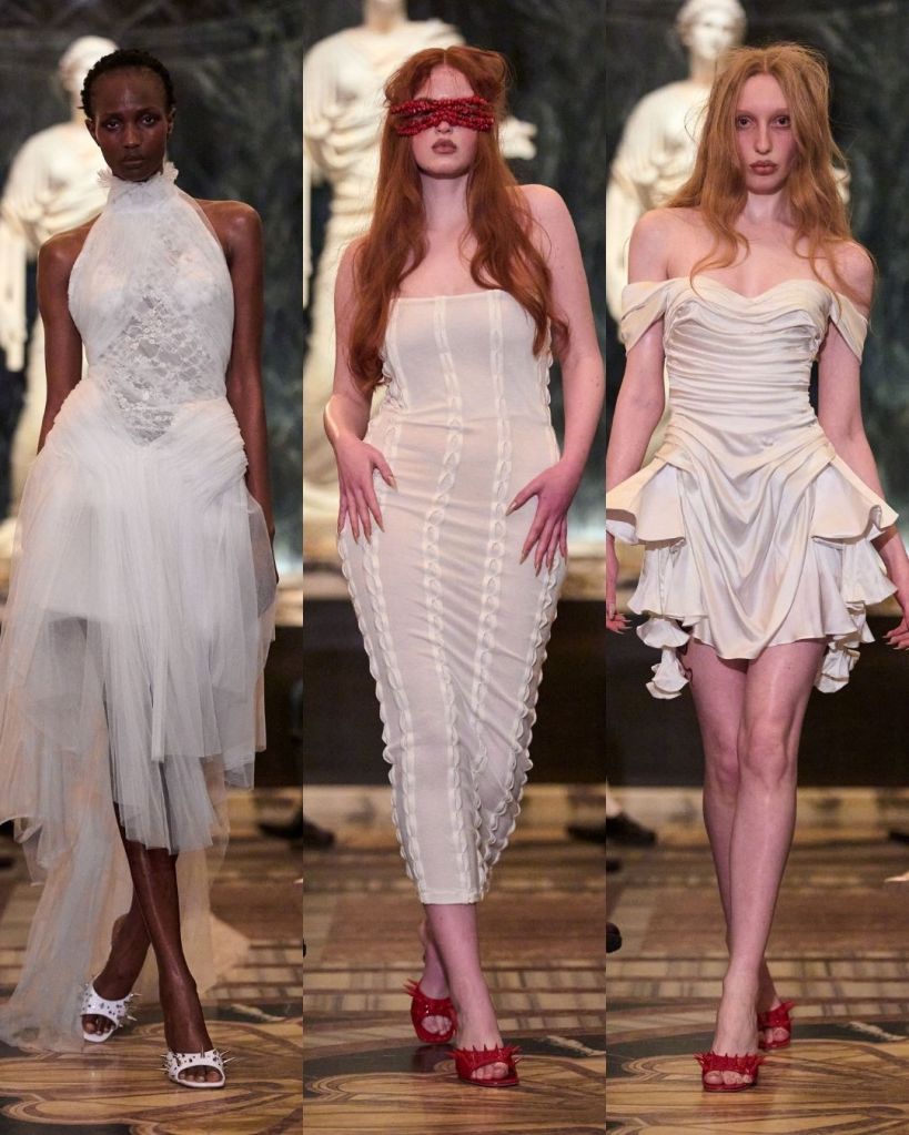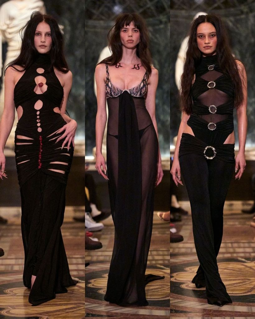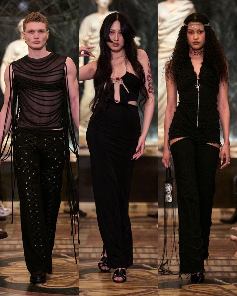 The sensuality was still front and center. But what made the show interesting was the attempt to expand beyond that familiar territory. Petsa introduced more daywear and structured pieces, suggesting a brand that is trying to grow into something bigger. A bamboo knit gray skirt suit, frayed denim separates, and a denim coat with black strap details hinted at a more wearable direction. There were even menswear looks and several bridal pieces, showing just how wide the designer wants the brand’s reach to be.