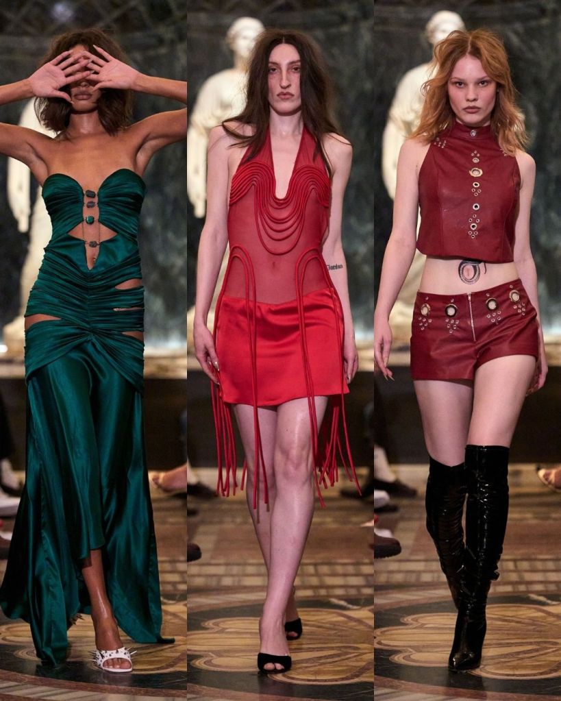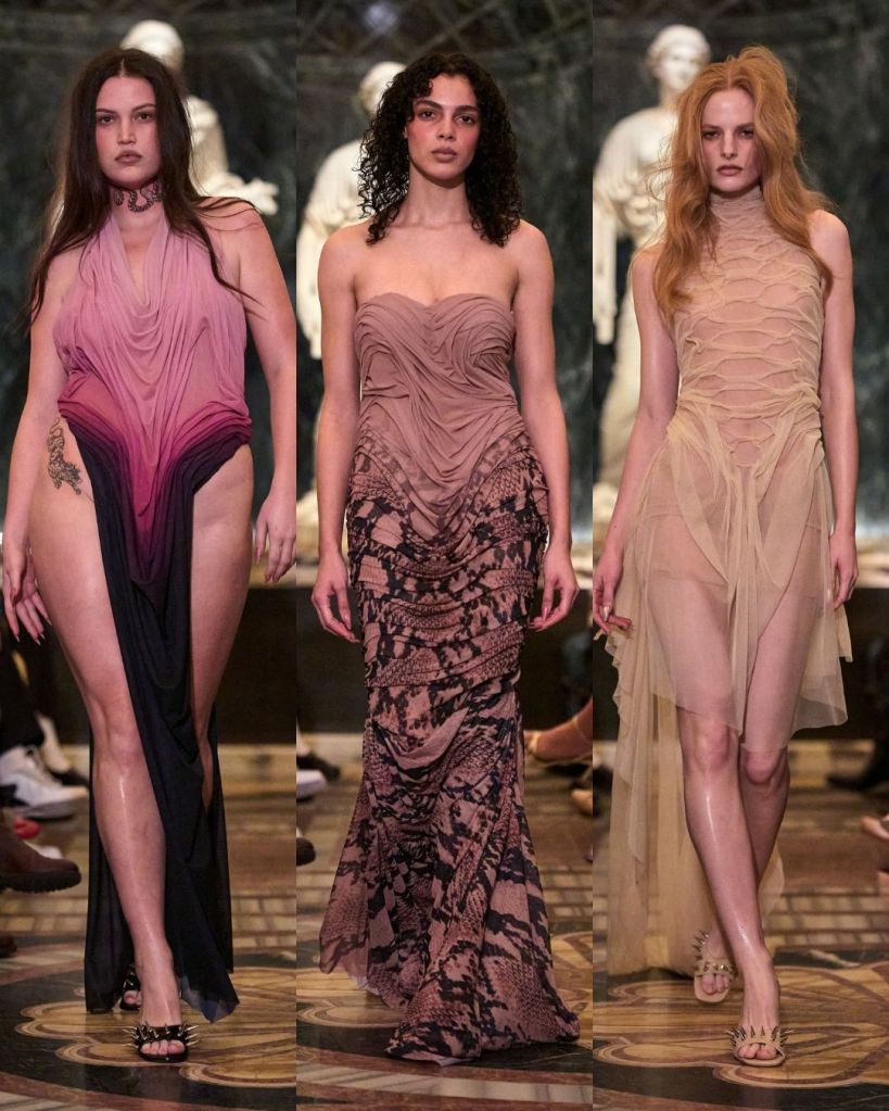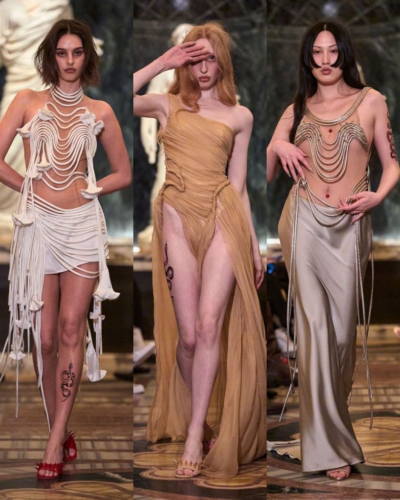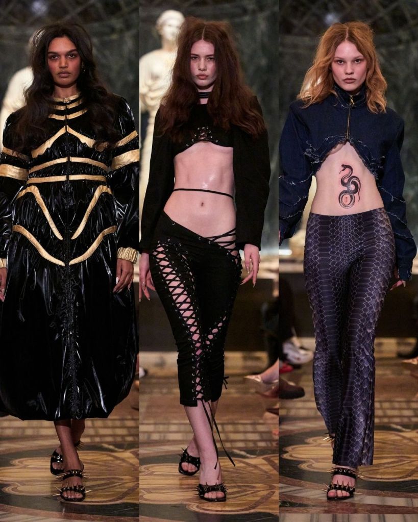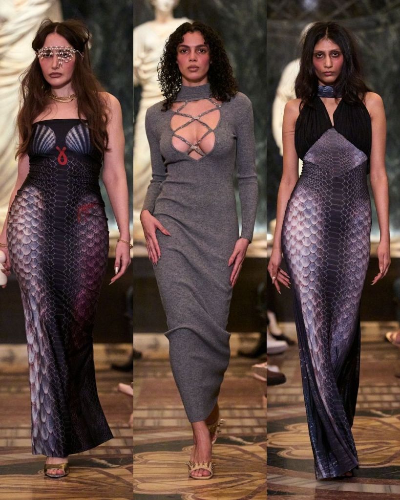 For Fall 2026, Petsa turned to the Greek myth of Medusa. Before she became the feared gorgon, Medusa was a beautiful nymph who found power through transformation and rage. That story of female strength and protection ran quietly through the collection. Snake-skin prints, messy hair, and serpent-like details nodded to the myth without turning it into costume.