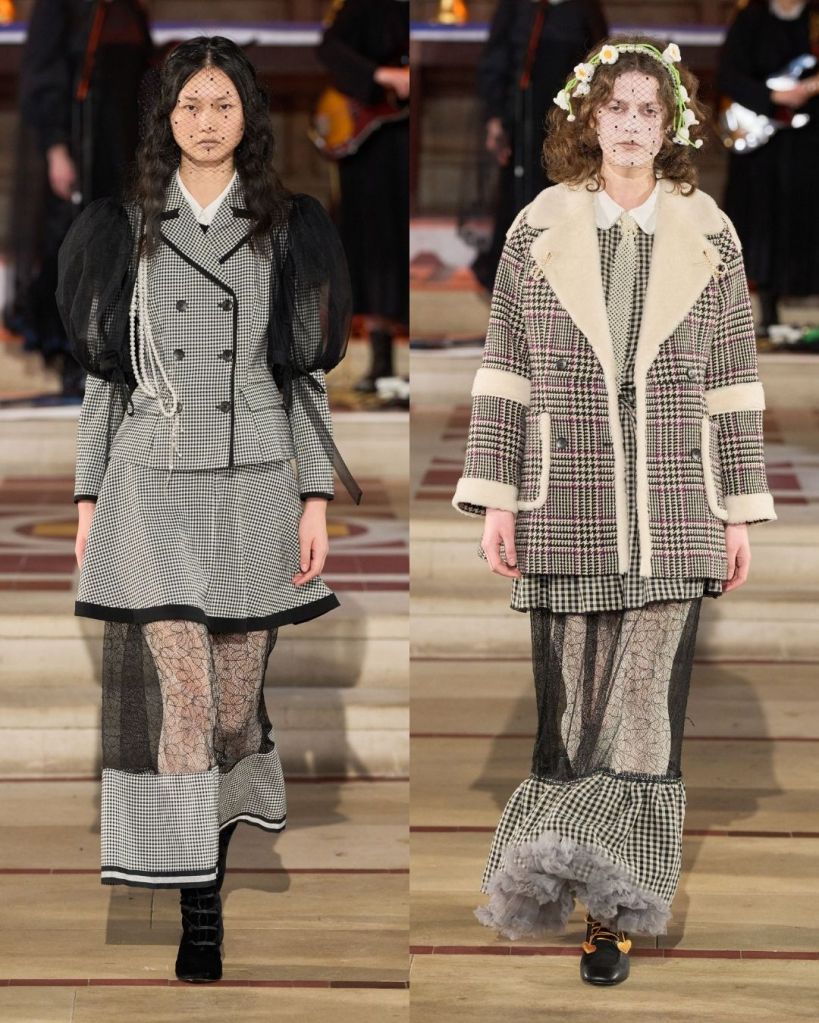 The collection unfolded almost like two chapters. The first imagined Sukie’s everyday life, with looks that nodded to historical workwear but still felt very much like Aksu’s world. There were crystal-dusted short suits, check wool skirt-trousers, martial-style jackets, and velvet puffers tied with ribbons. Even in these more grounded pieces, there was softness. Sheer fabrics peeked through tailored shapes, creating that delicate tension Aksu does so well.