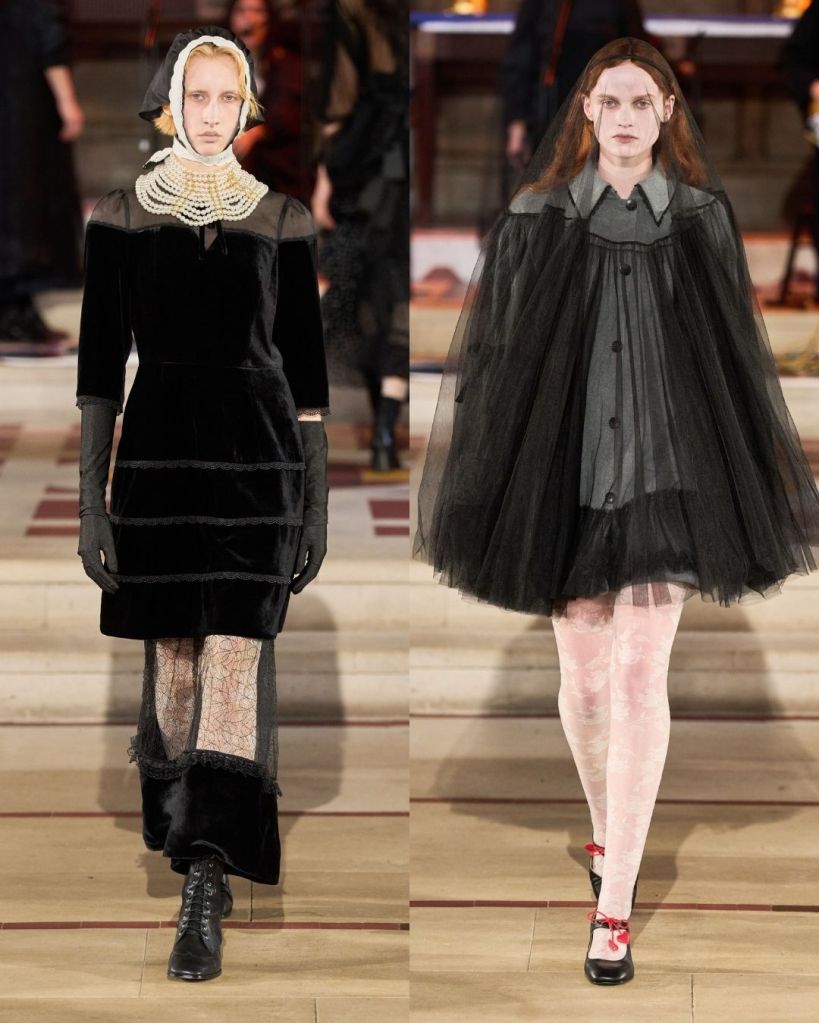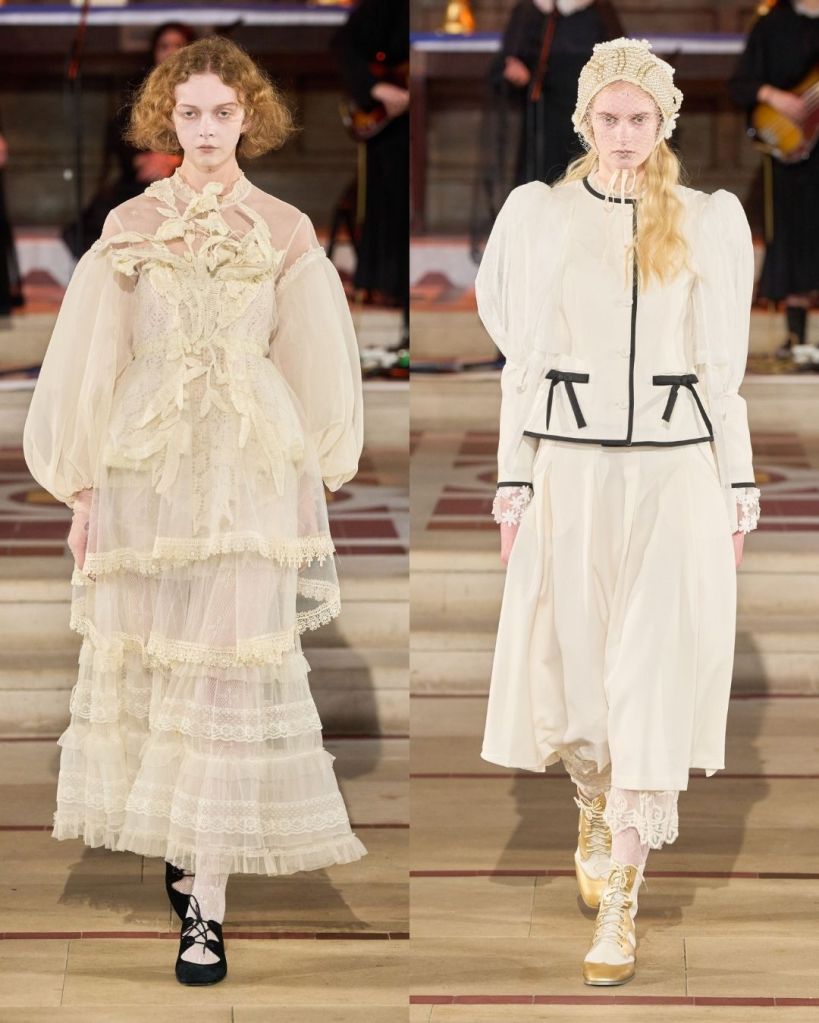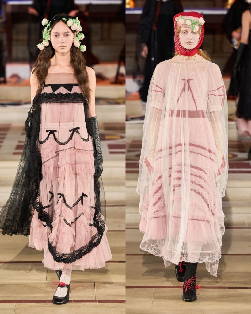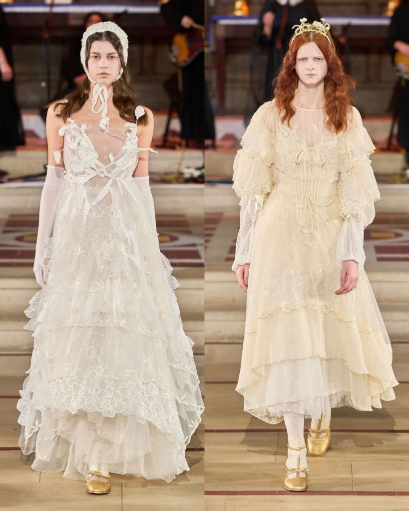 Then things became dreamier. As the story shifted toward Sukie’s ghostly presence, the clothes followed. Polka dot gowns with ruffled layers, puff sleeve dresses, and lace topped silhouettes floated down the runway. The sheer play throughout the collection really stood out. Transparent tulle, gossamer capelets, and airy lace layers gave many of the dresses a weightless quality, like they could drift away at any moment.