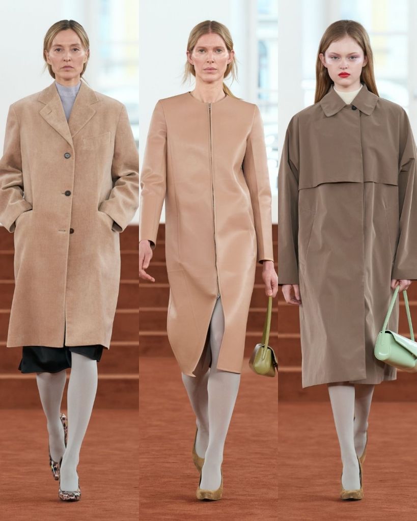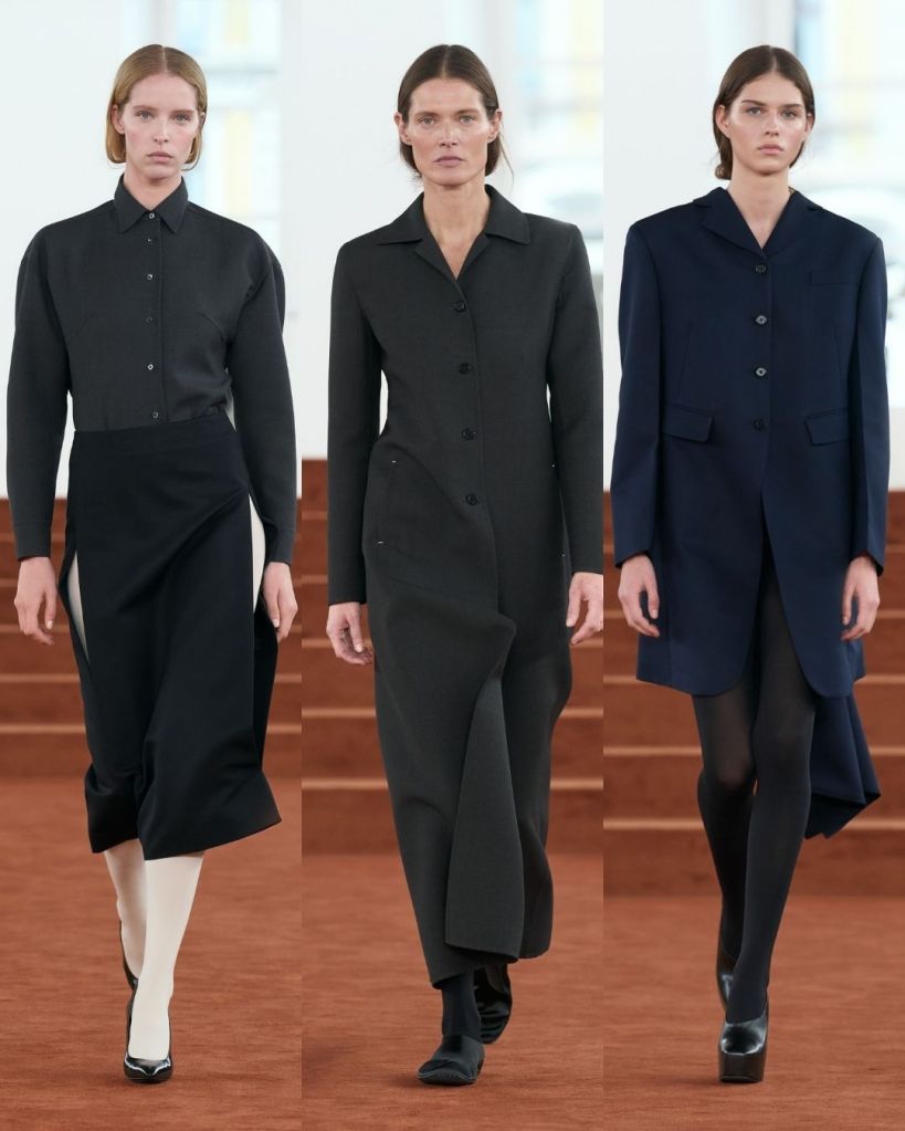 The collection still carried the house’s signature minimalism, but it came with small disruptions. Tailoring remained the backbone. Long blazers, structured coats, and clean skirts kept the silhouettes sharp and controlled. But Bellotti introduced subtle distortions. Collars slipped slightly out of place. Shoulders looked detached from the body. Some jackets curved around the torso in what he called “banana” shapes, softly embracing the figure rather than sitting rigidly on it.