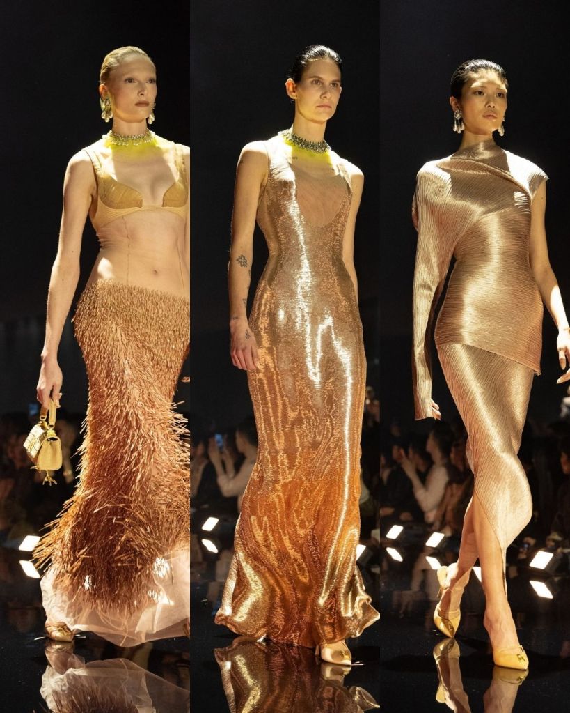 Textures were everywhere. Aran knits were sliced with illusion tulle so they seemed to float on the body. Silk pieces were laminated to create a glossy, sculptural surface. Some looks played with trompe l’oeil effects, like printed crocodile scales or leather like finishes that were actually silk wool. One standout set was made from cassette tapes and thousands of CDs, turning nostalgic tech into a shimmering disco moment.