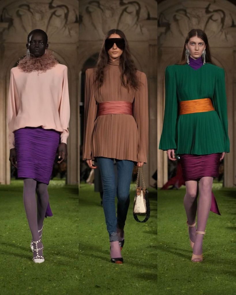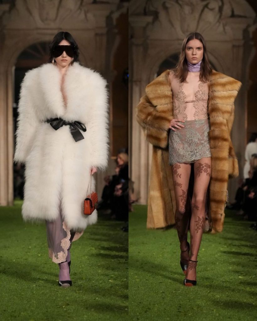 There were plenty of striking pieces. Rounded, exaggerated shoulders appeared on coats and jackets, often cinched with bow-tied belts or wide satin waistbands. Pleated tunics layered over lace-trimmed jeans, leather wraps sat next to full-length furs, and sequined jackets introduced sharp graphic color combinations. Michele also leaned into asymmetry and sculptural drapery, sometimes placing the most interesting detail at the back of garments, a quiet nod to Valentino Garavani’s own design language.