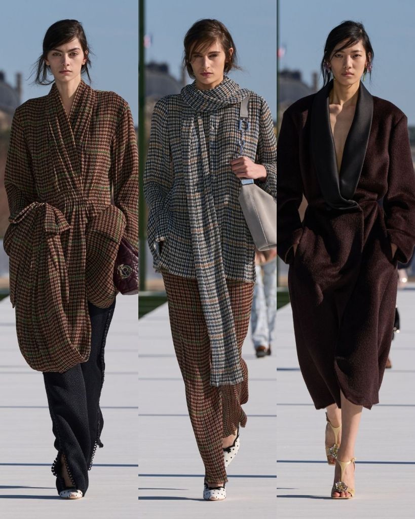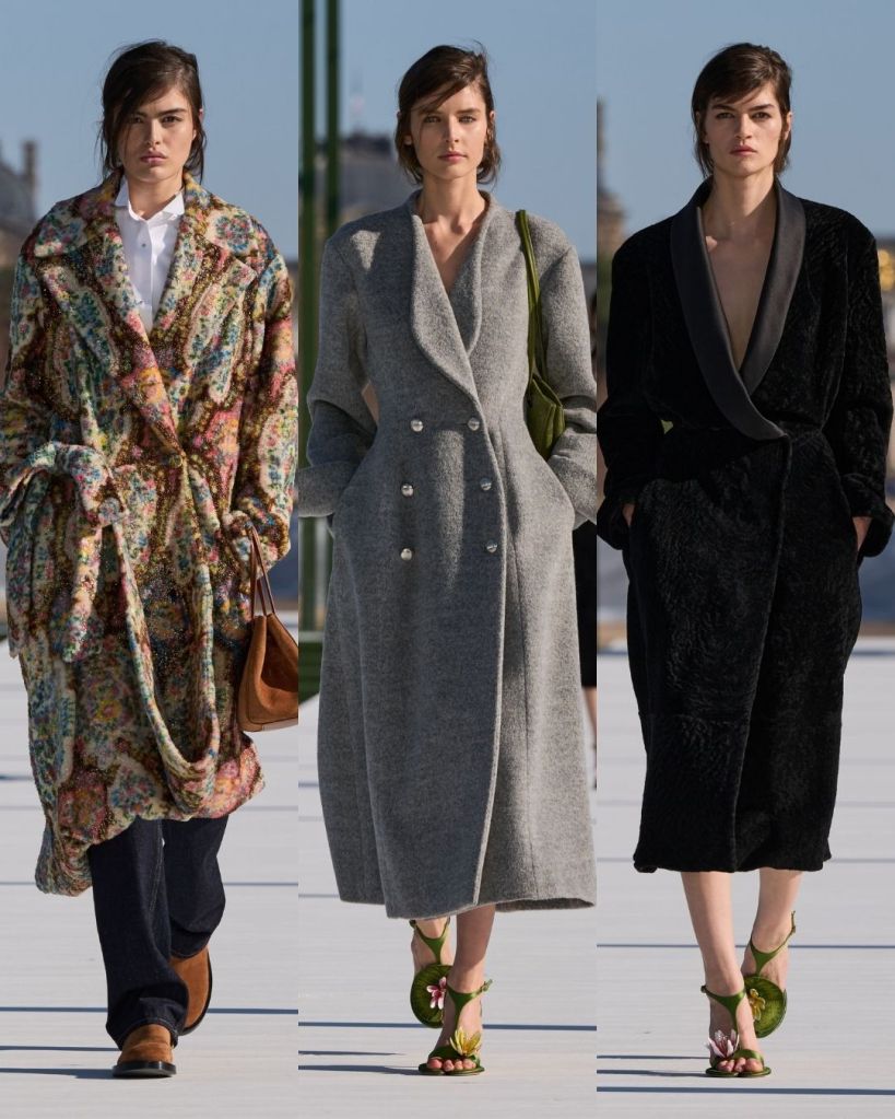 The balance between structure and softness was what really worked here. Clean tailoring appeared in checked suits and frock coats, but Anderson stripped away the heaviness. Menswear fabrics were turned into delicate pleated silk, while coats wrapped loosely like dressing gowns. It felt polished but never stiff.