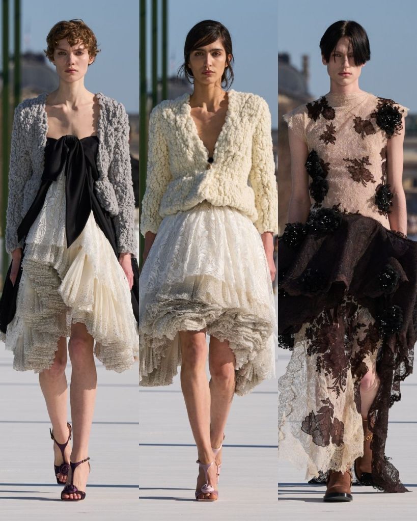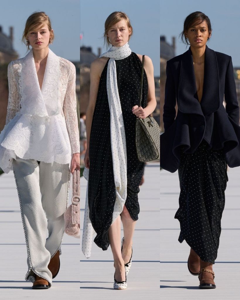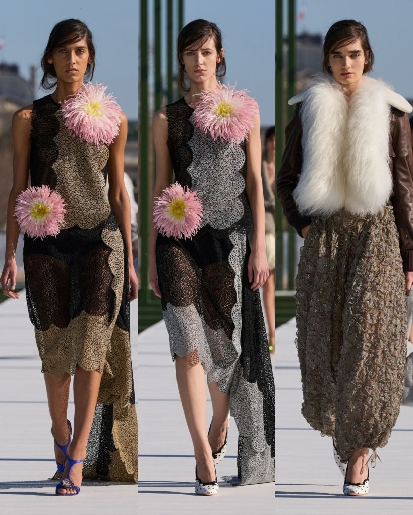 Then there were the details. Flowers kept appearing in different ways, inspired by the water lilies in the garden. Raffia blooms, floral lace, and textured embellishments seemed to burst across dresses and jackets. The lily shaped heels and polka dotted footwear added a playful touch, while those knit style bags were surprisingly charming. I was unsure about them before, but I’m slowly warming up.