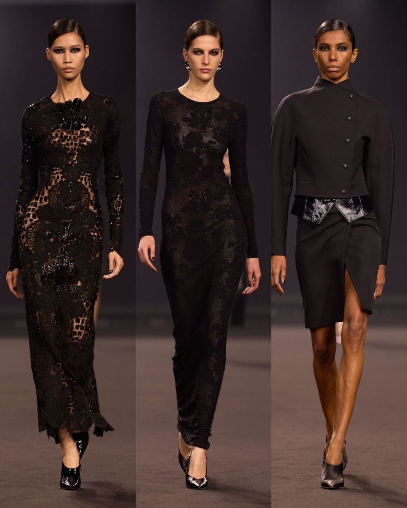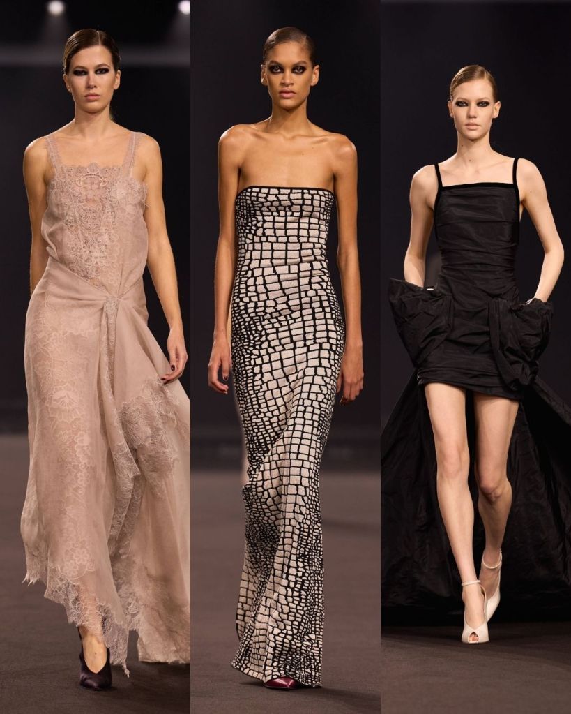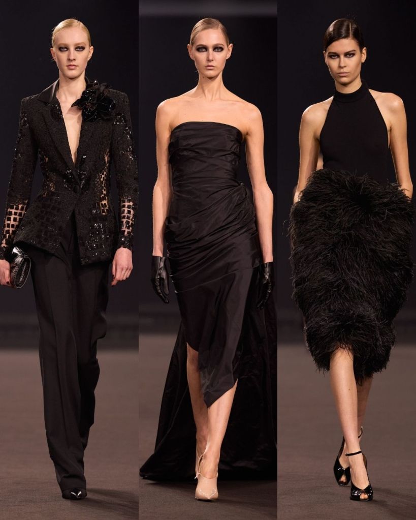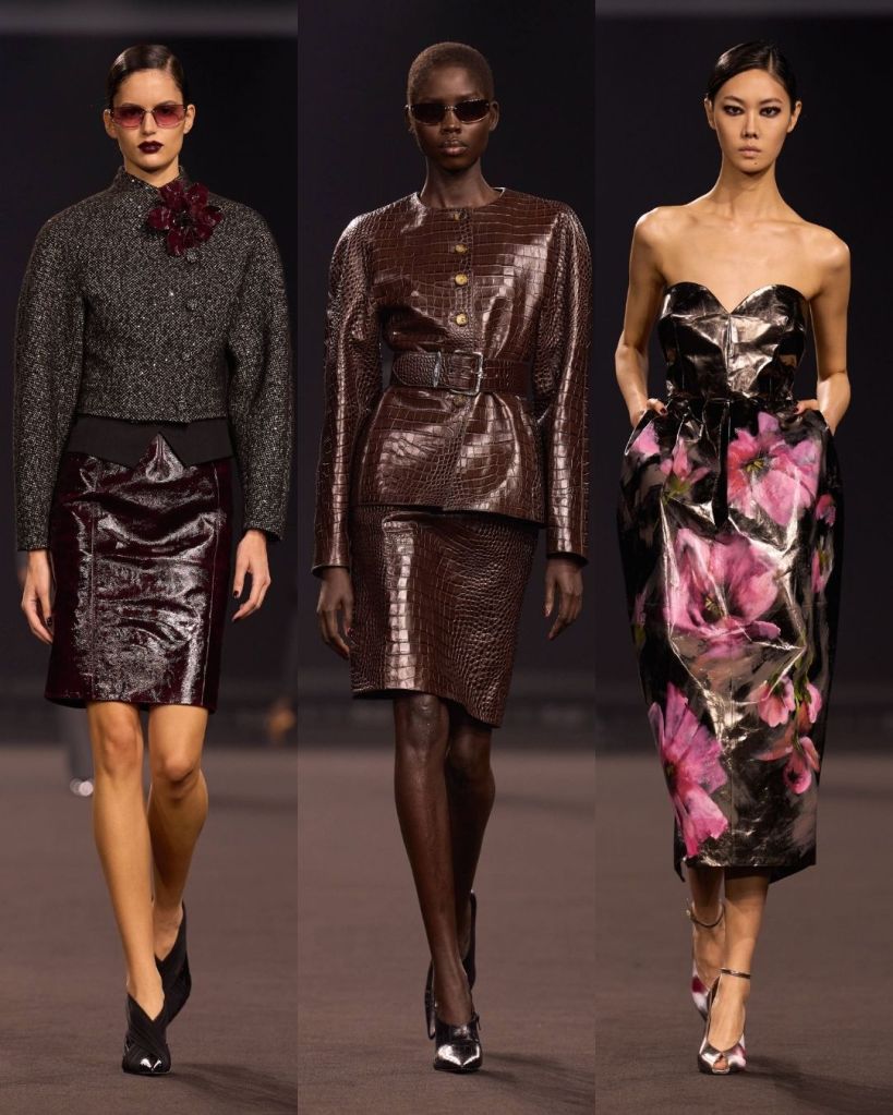 The silhouettes were very crisp and controlled. Pencil skirts, tailored trousers, and sculpted jackets gave the collection a clean structure. Many looks felt quietly powerful, almost reminiscent of the sleek sensuality associated with designers like Tom Ford or the bold glamour of Versace in the 90s. It was a direction that felt new for Saab, and honestly, pretty refreshing.