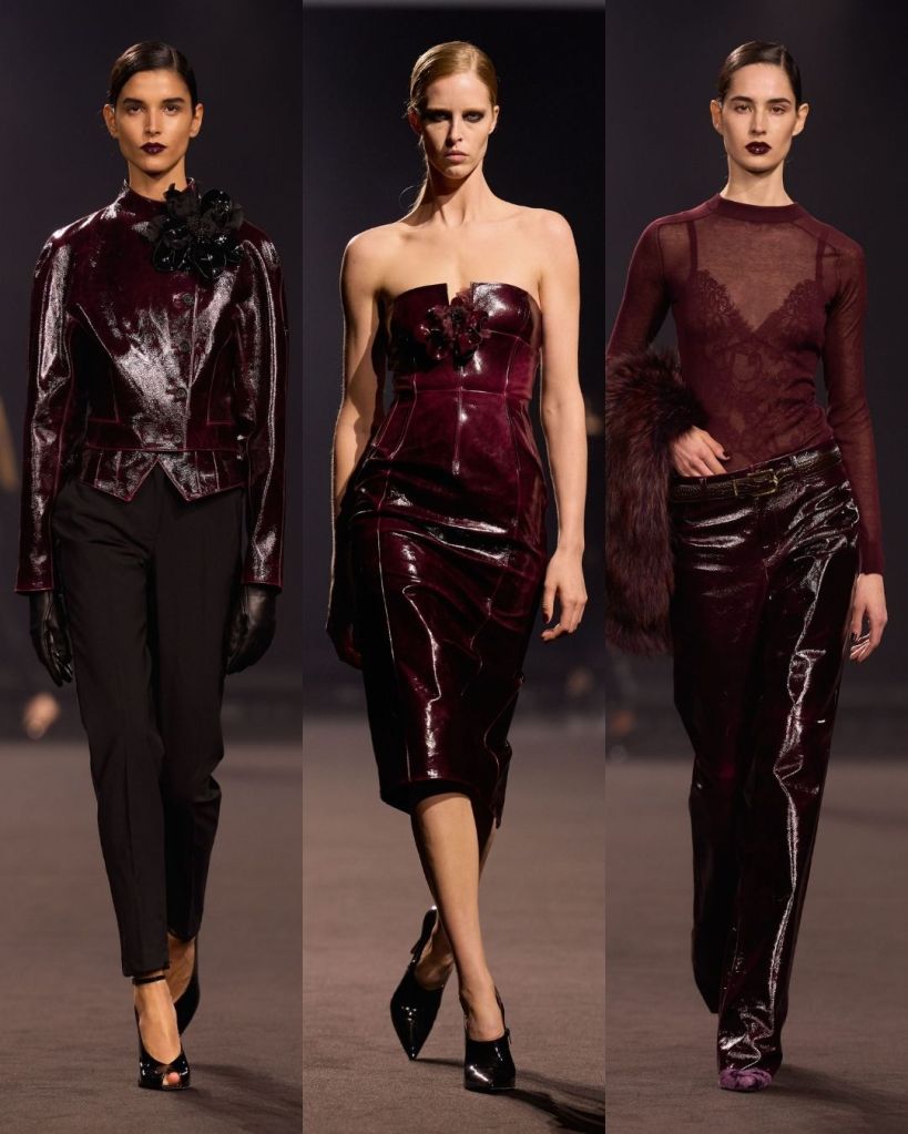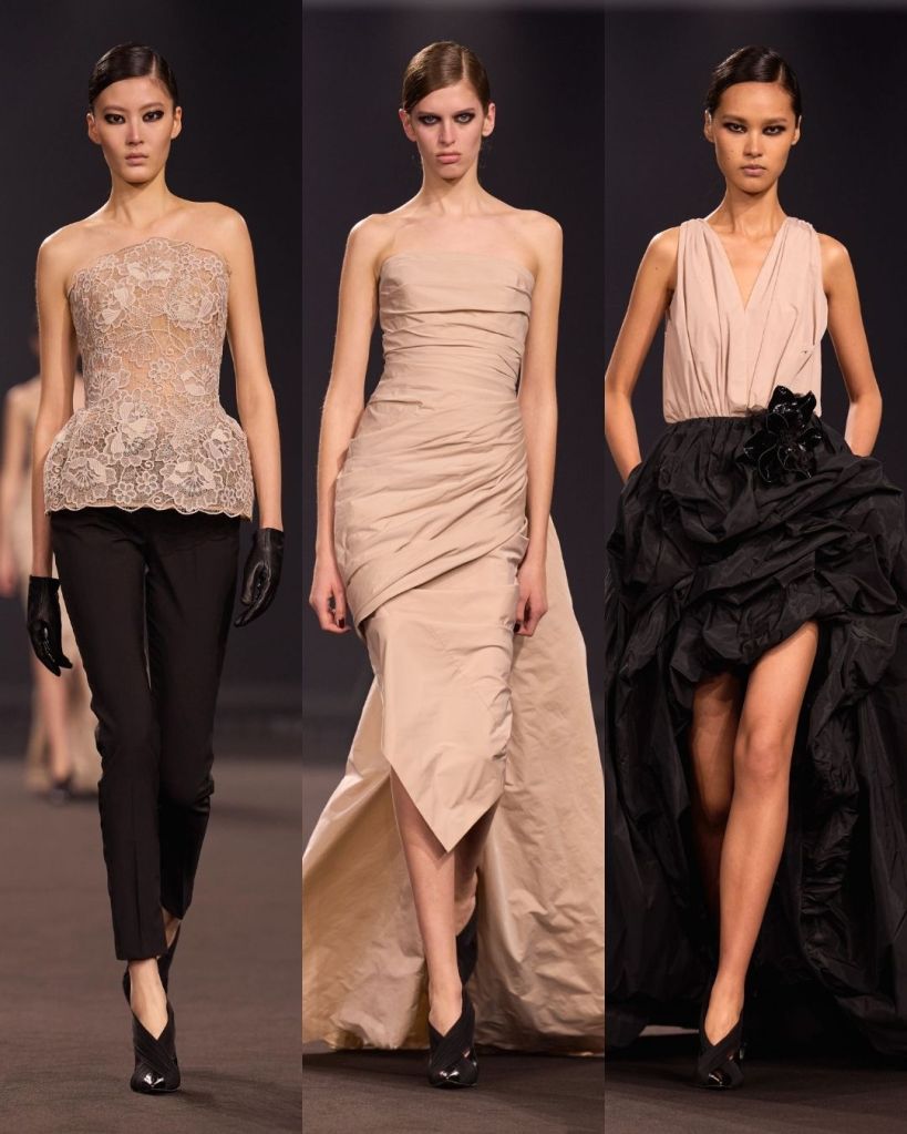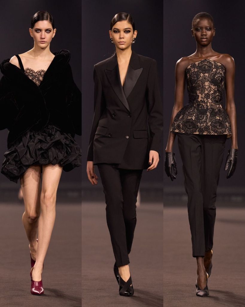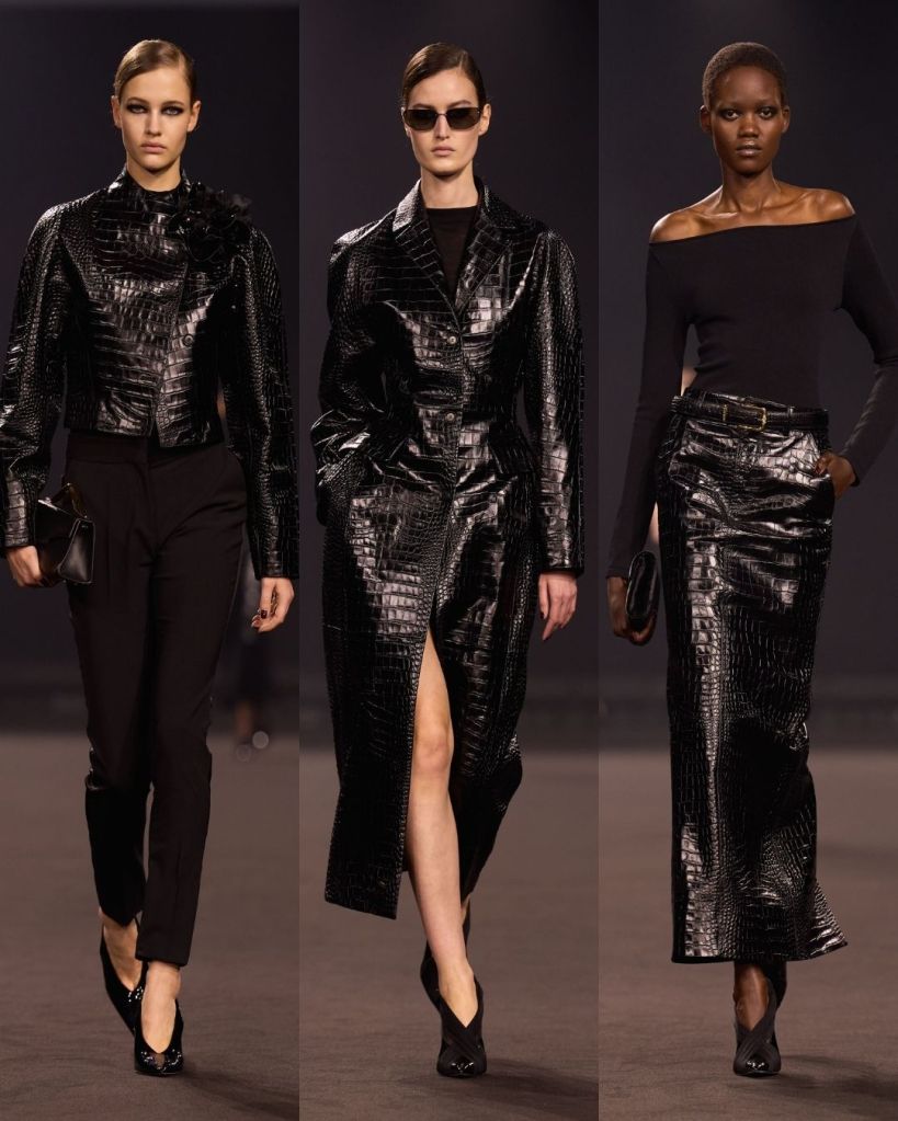 The silhouettes were very crisp and controlled. Pencil skirts, tailored trousers, and sculpted jackets gave the collection a clean structure. Many looks felt quietly powerful, almost reminiscent of the sleek sensuality associated with designers like Tom Ford or the bold glamour of Versace in the 90s. It was a direction that felt new for Saab, and honestly, pretty refreshing.