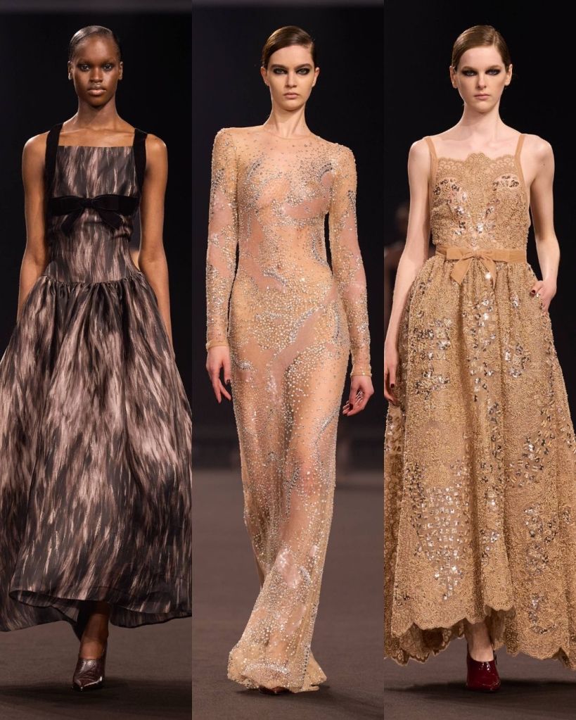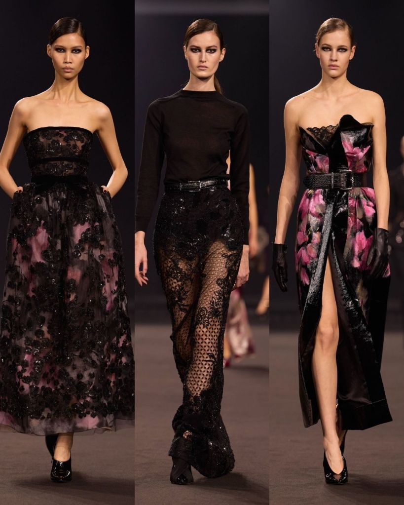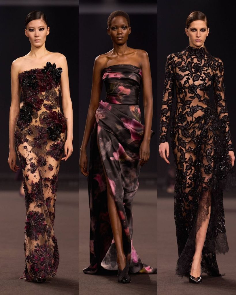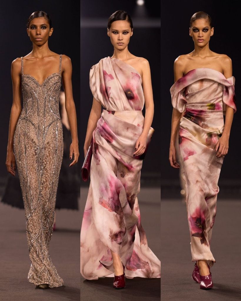 Titled Midnight in Manhattan, felt like a surprising shift in attitude for the designer. Saab is usually associated with classic glamour and red carpet romance, but this season had a sharper edge. The inspiration came from 1990s New York, particularly the contrast between uptown elegance and downtown attitude. That tension shaped the entire collection. From the first look, a cherry red leather bustier dress emerging through a misty runway, the tone was clear. This was Saab stepping into a cooler, more modern space.