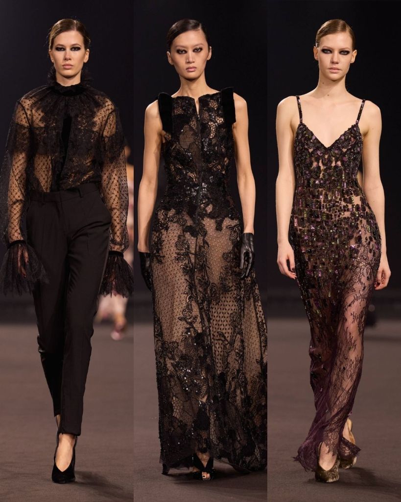 What made the collection interesting was how it balanced edge with elegance. Velvet puffers and fine knits introduced a more everyday feeling, while sheer gowns, lace dresses, and shimmering naked dresses brought back the evening drama Saab is known for.