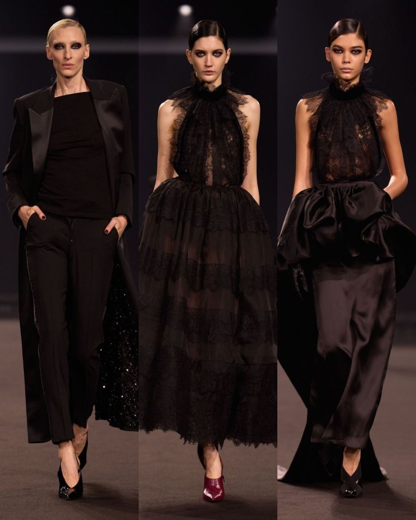 The styling helped reinforce the mood. Smoky eyes, sleek hair, and sharp stiletto heels gave the models a uniform that felt confident and a little rebellious. The collection felt very cool. That might not be the first word people usually associate with Elie Saab, but this season, it worked.