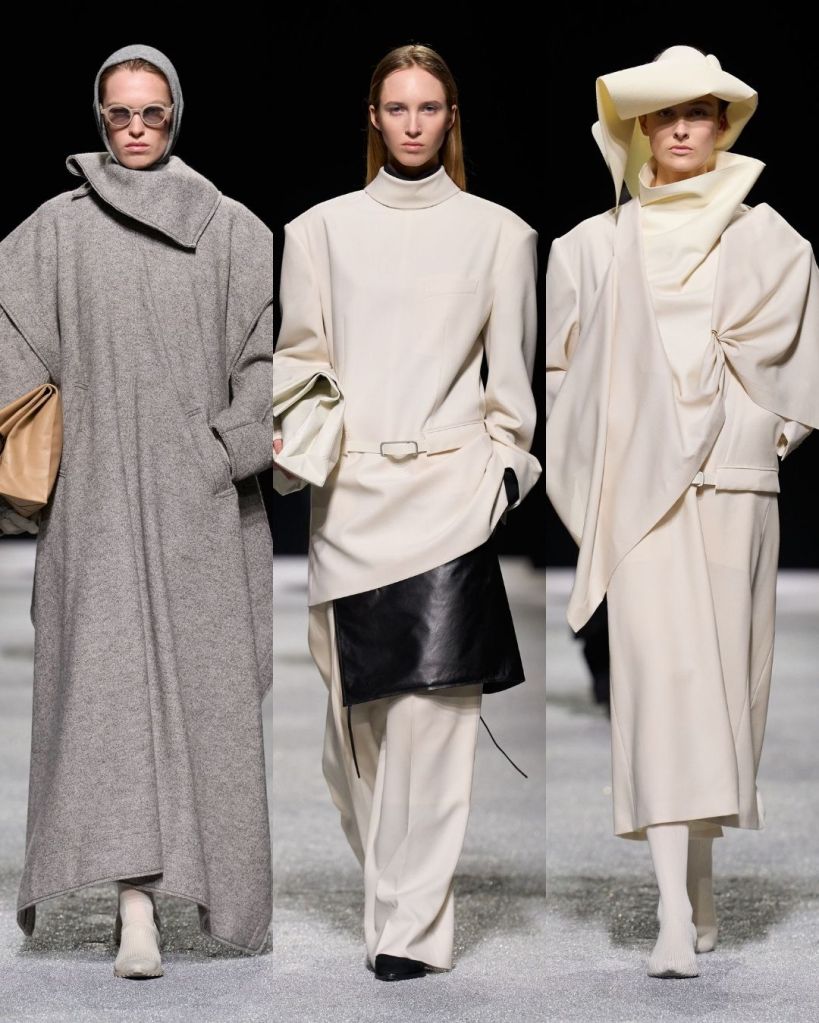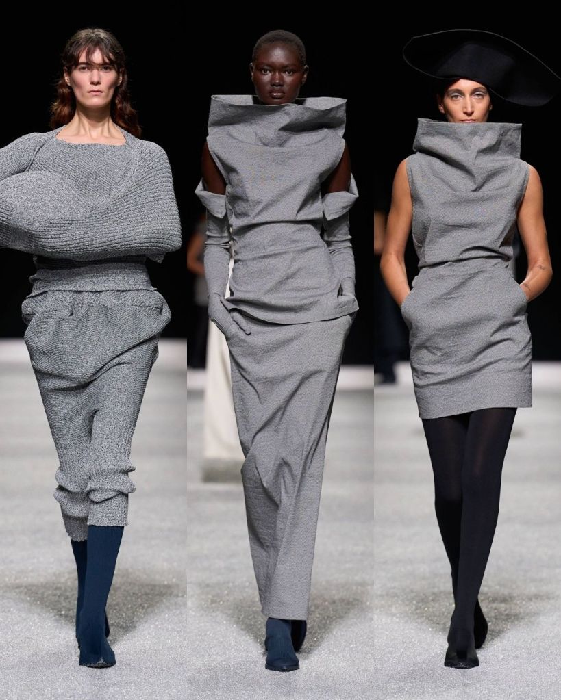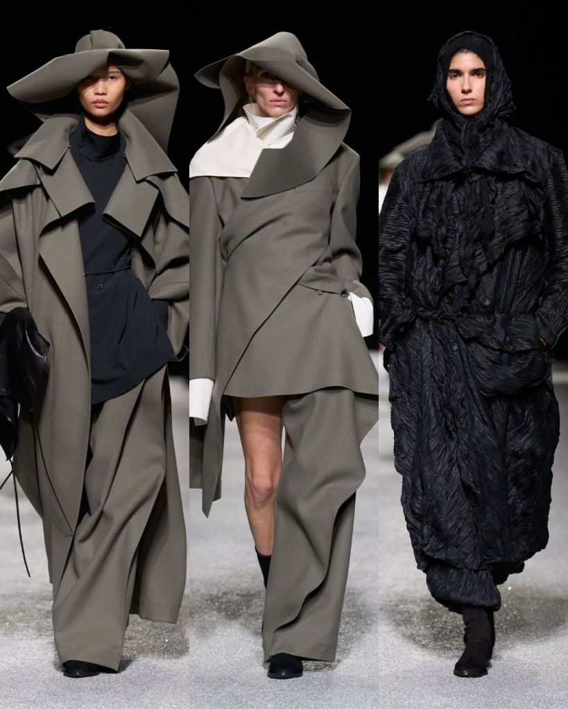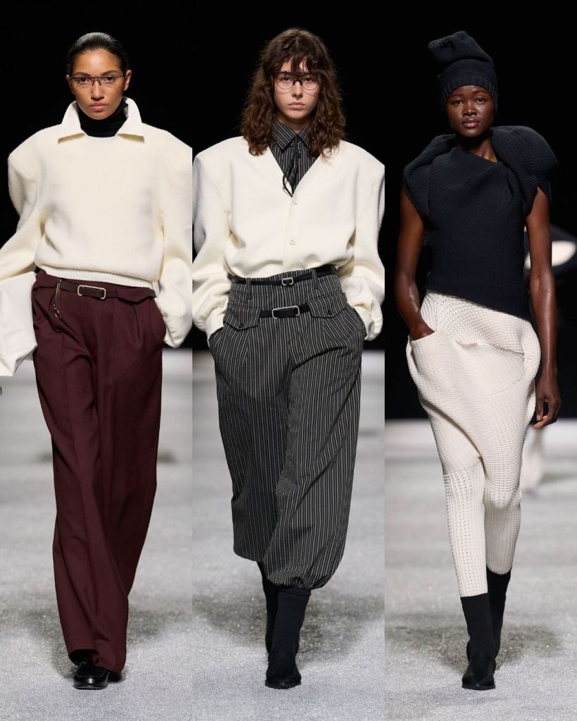 The textures were just as compelling. Pleated garments rippled like coral or fossils, knits formed broad shoulders, and coats appeared almost papery in structure. At times the silhouettes pushed into more conceptual territory, including unusual knit constructions or asymmetrical trousers, but many pieces still felt like things you could genuinely imagine in your closet.