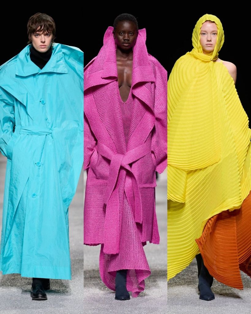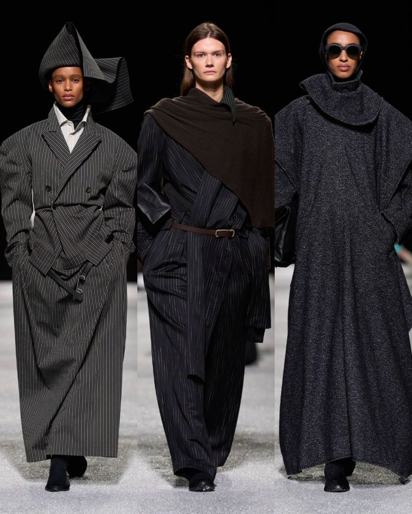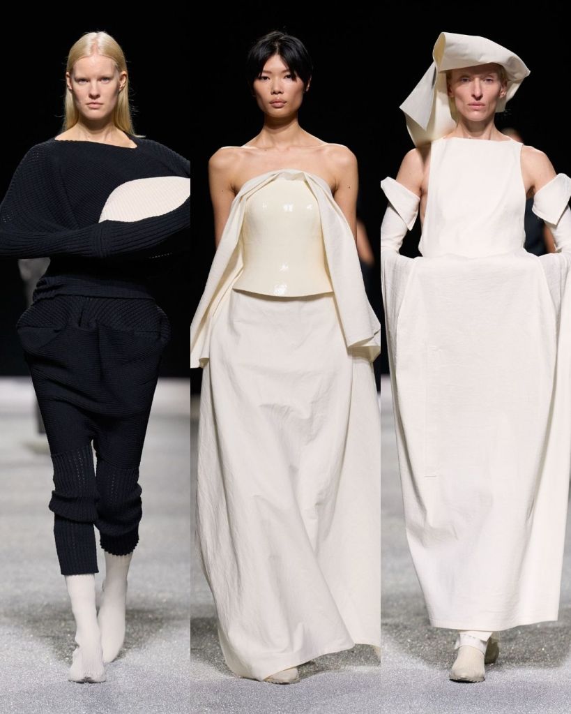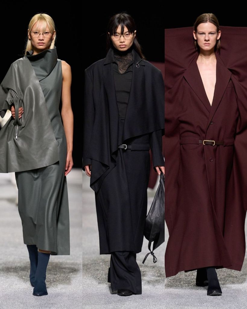 The textures were just as compelling. Pleated garments rippled like coral or fossils, knits formed broad shoulders, and coats appeared almost papery in structure. At times the silhouettes pushed into more conceptual territory, including unusual knit constructions or asymmetrical trousers, but many pieces still felt like things you could genuinely imagine in your closet.