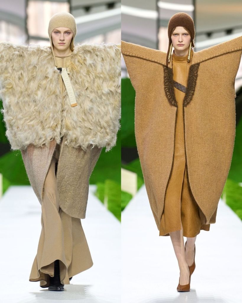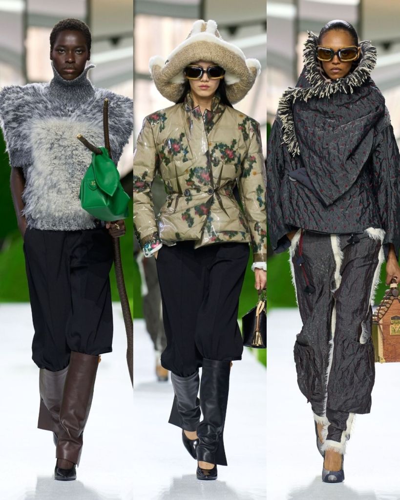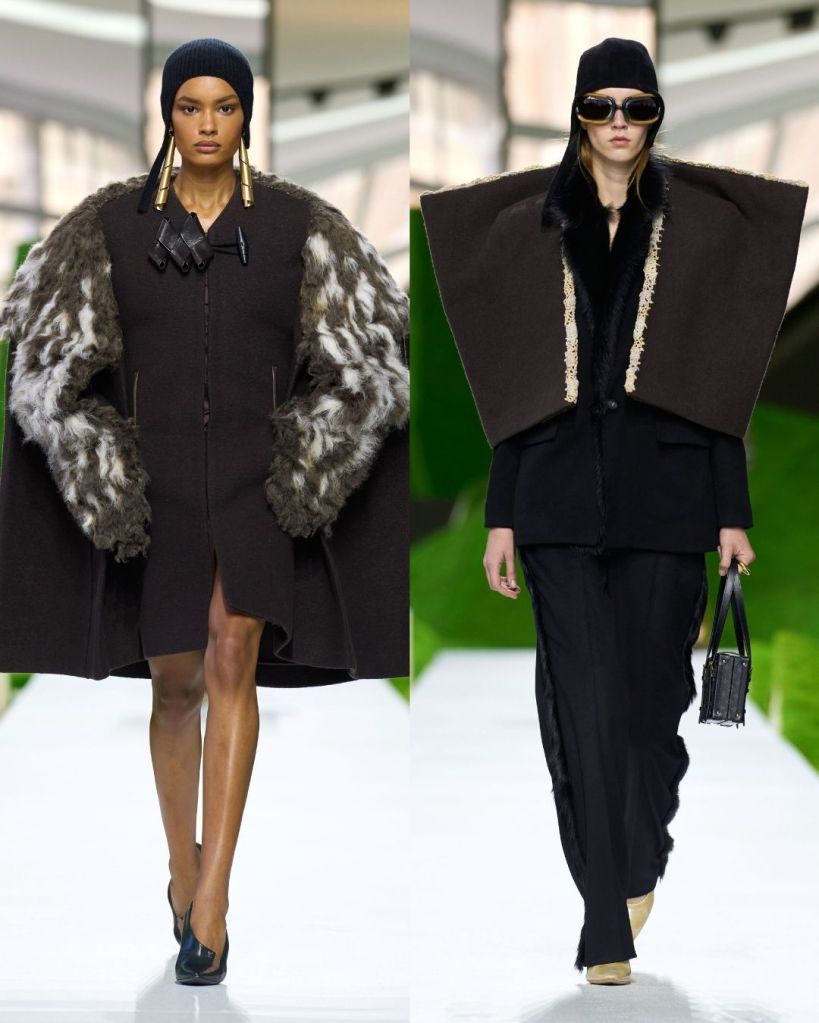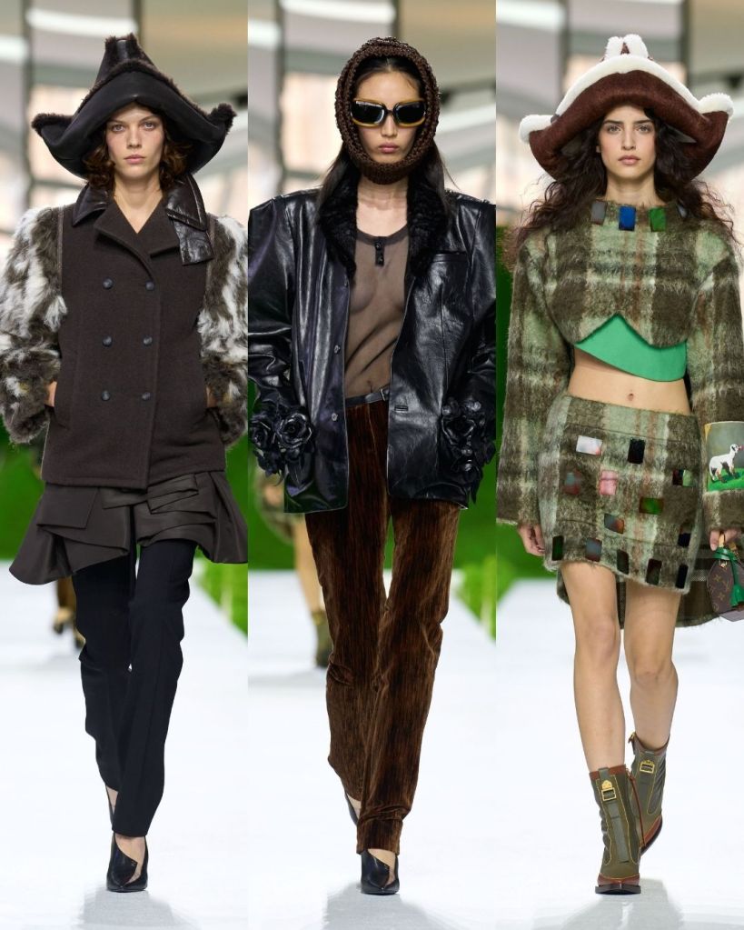 The clothes leaned heavily into protection, texture, and structure. Shaggy wool capes, shearling hats that curved like paper boats, and stiff outerwear with exaggerated shoulders created silhouettes that felt both primitive and futuristic. Some pieces echoed traditional shepherd garments like the Turkish kepenek, but they were rendered in brushed animal hair or leather trimmed wool, making them unmistakably Vuitton.