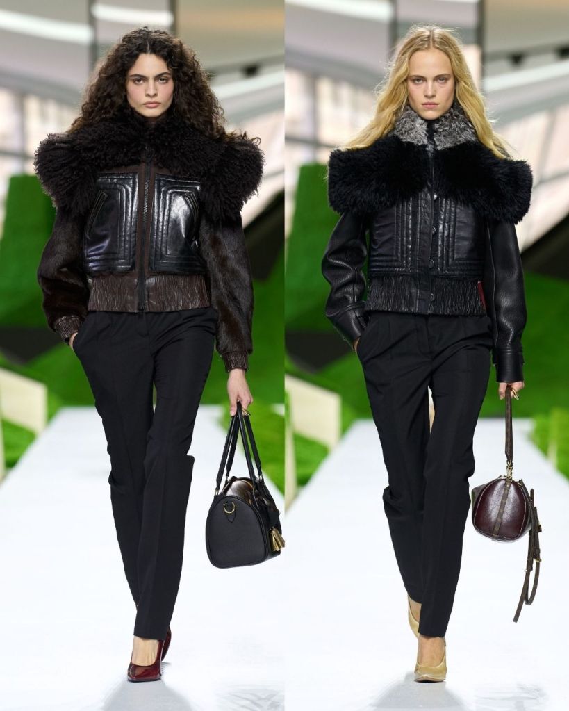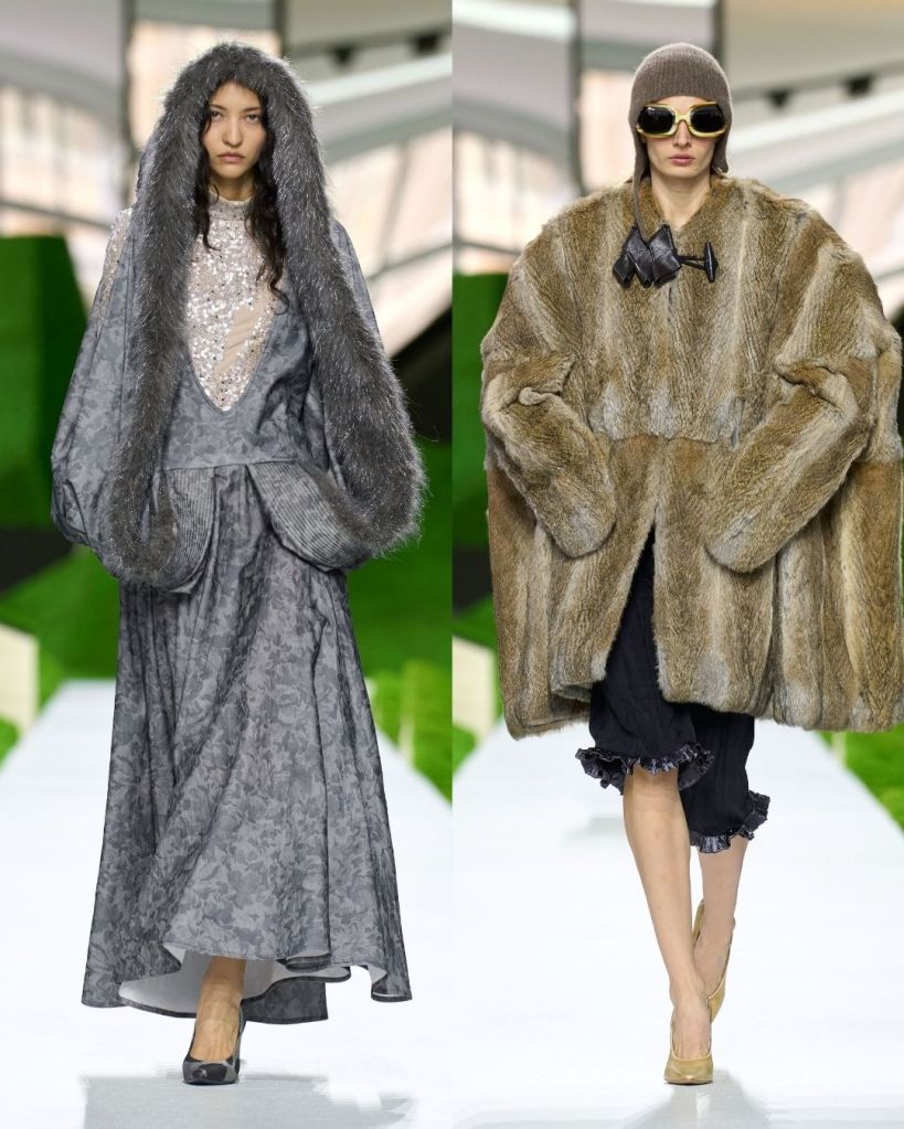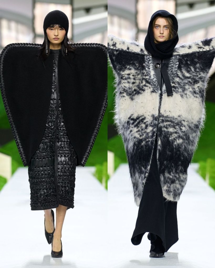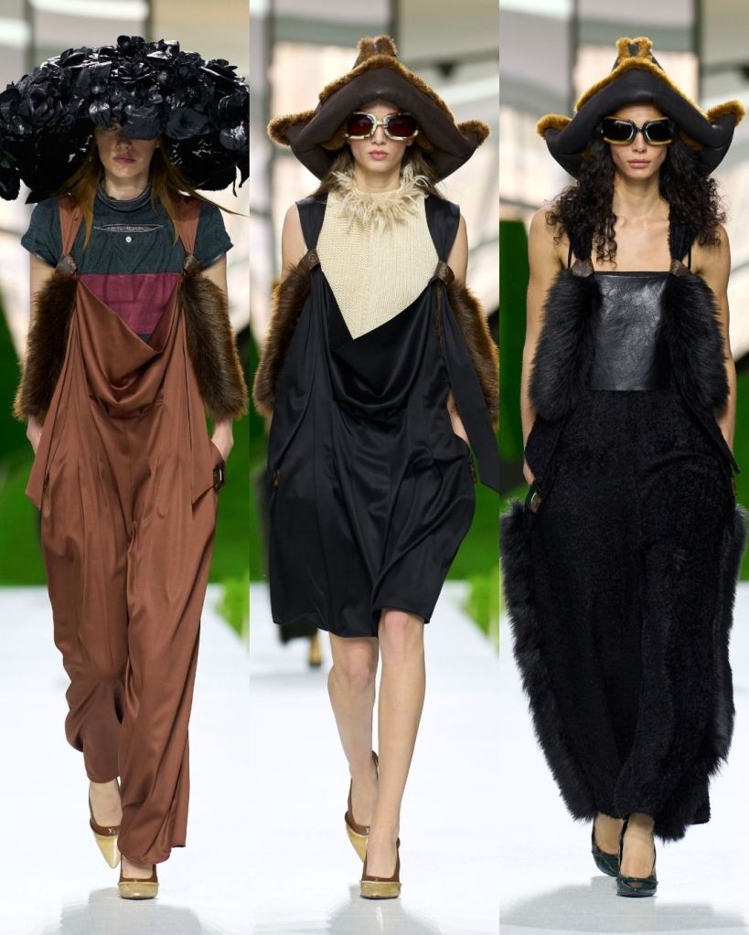 The clothes leaned heavily into protection, texture, and structure. Shaggy wool capes, shearling hats that curved like paper boats, and stiff outerwear with exaggerated shoulders created silhouettes that felt both primitive and futuristic. Some pieces echoed traditional shepherd garments like the Turkish kepenek, but they were rendered in brushed animal hair or leather trimmed wool, making them unmistakably Vuitton.