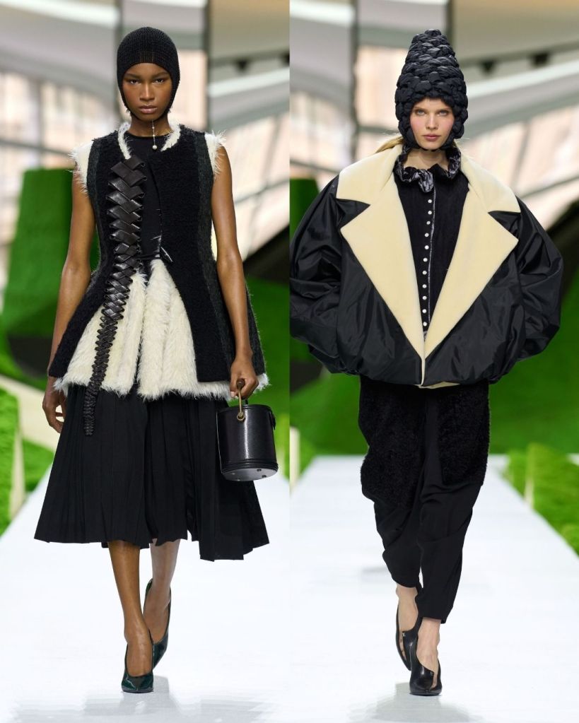 This time, Nicolas Ghesquière built the collection around what he called “an anthropology of fashion.” The idea was to look at clothing worn by mountain communities across the world and reinterpret it through his very specific, very avant garde lens. The show itself reflected that fantasy. Set inside a mossy, geometric “neo landscape” at the Louvre, designed by Severance production designer Jeremy Hindle, the runway felt like a surreal alpine dream.