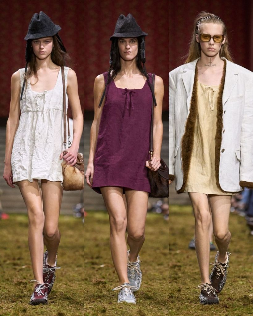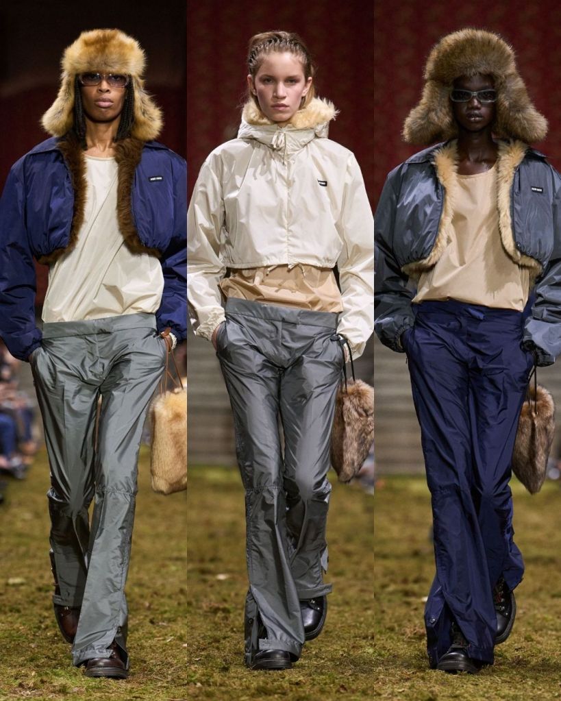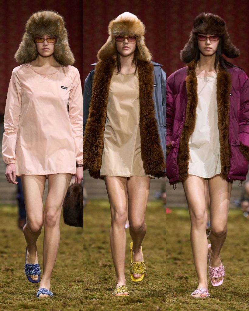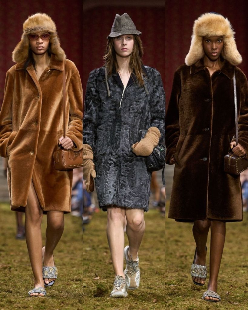 Outerwear and accessories added personality. Fur-effect coats, trapper hats, and cropped puffers brought texture and volume, while the brand’s chunky shoes and glittery platforms reminded everyone that Miu Miu still knows how to have fun with styling.