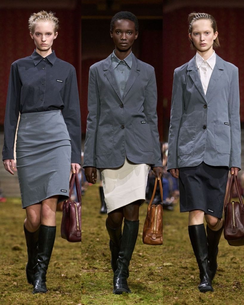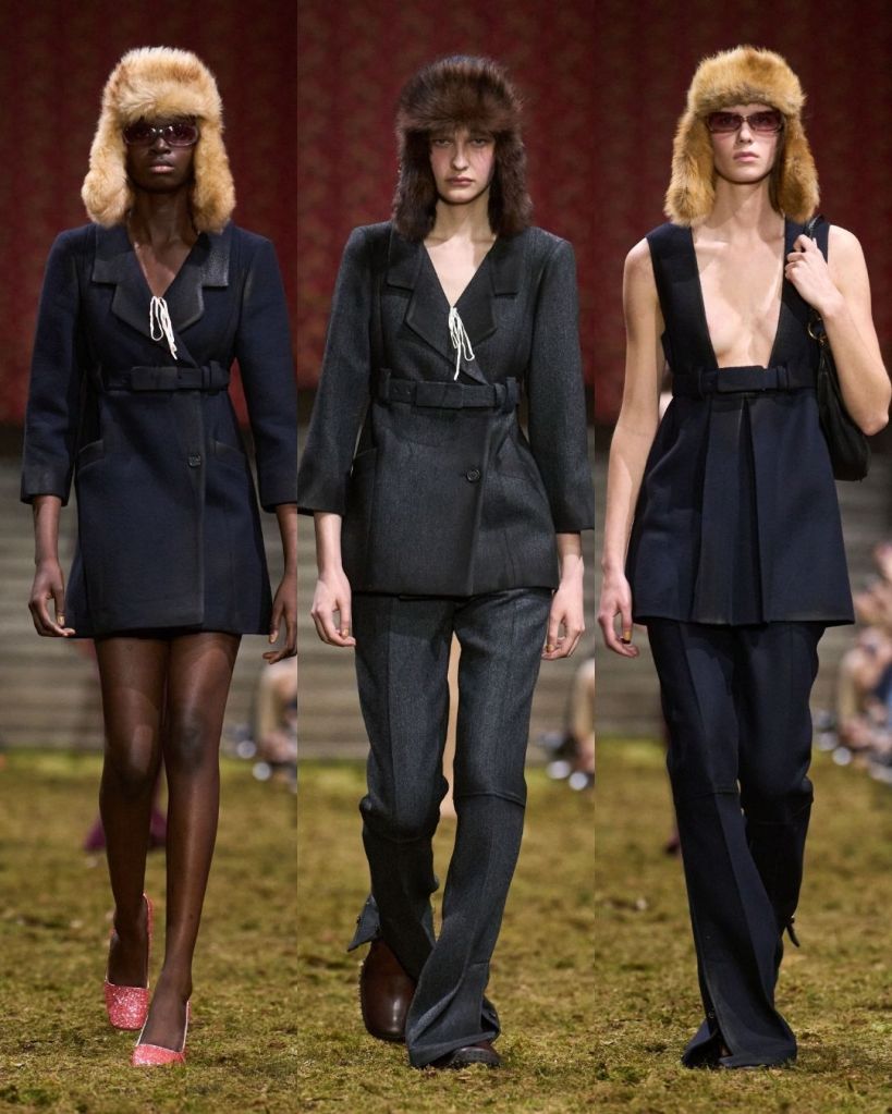 The wardrobe leaned into familiar shapes that felt easy to recognize. There were ’70s-style trouser suits, neat pencil skirts, simple shirts, and short shift dresses. The color palette stayed classic too, mostly black, gray, camel, and burgundy. It gave the whole collection a sense of stability, like Prada was focusing on the basics rather than chasing novelty.