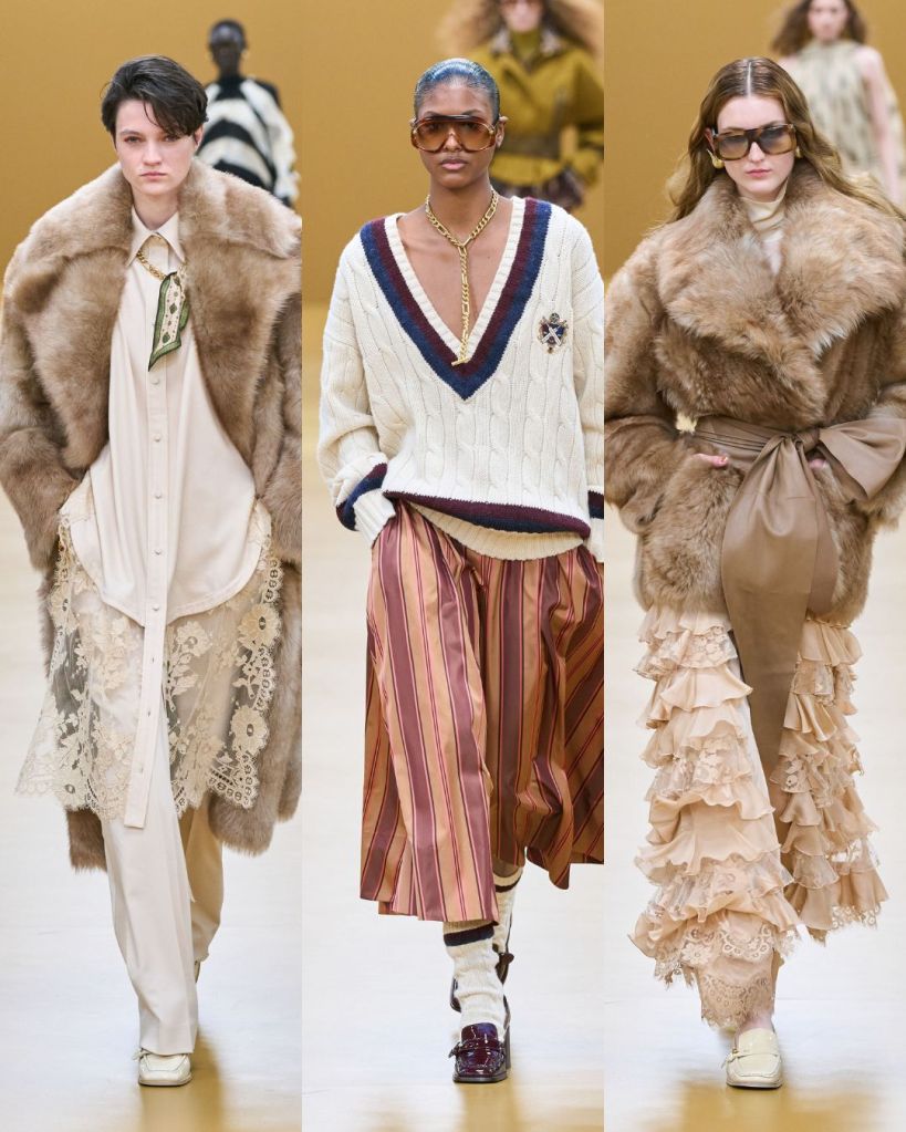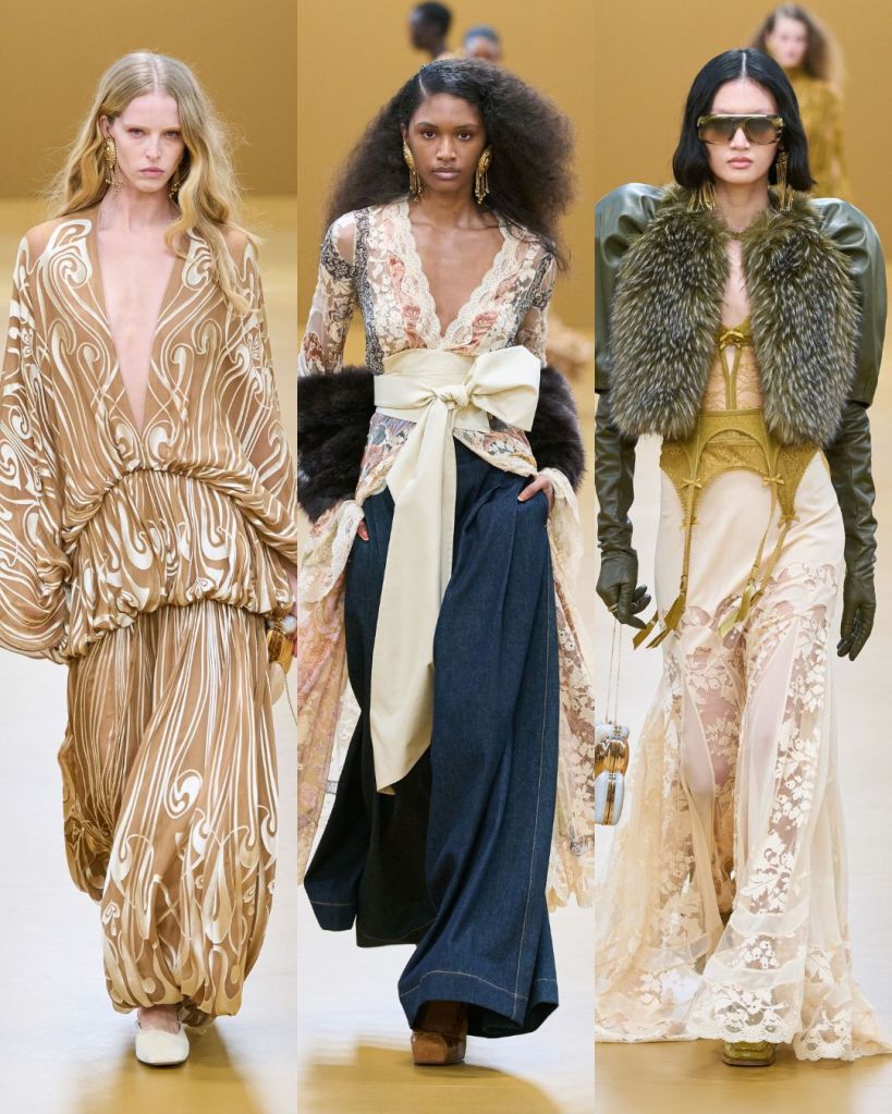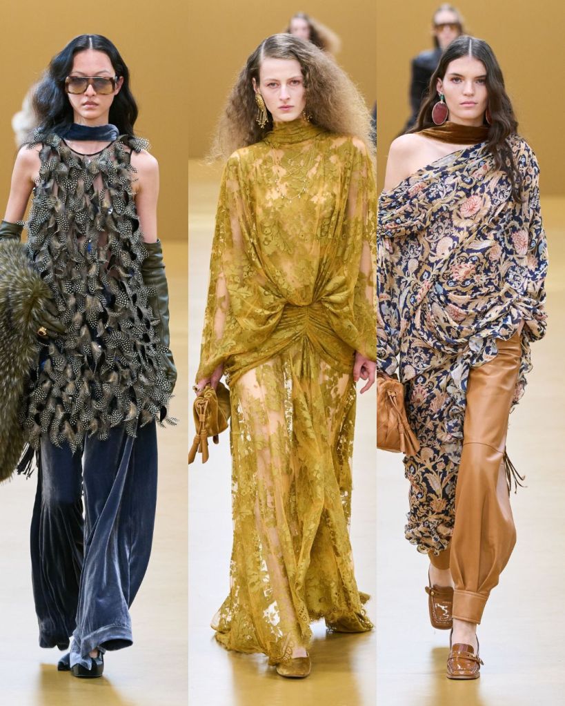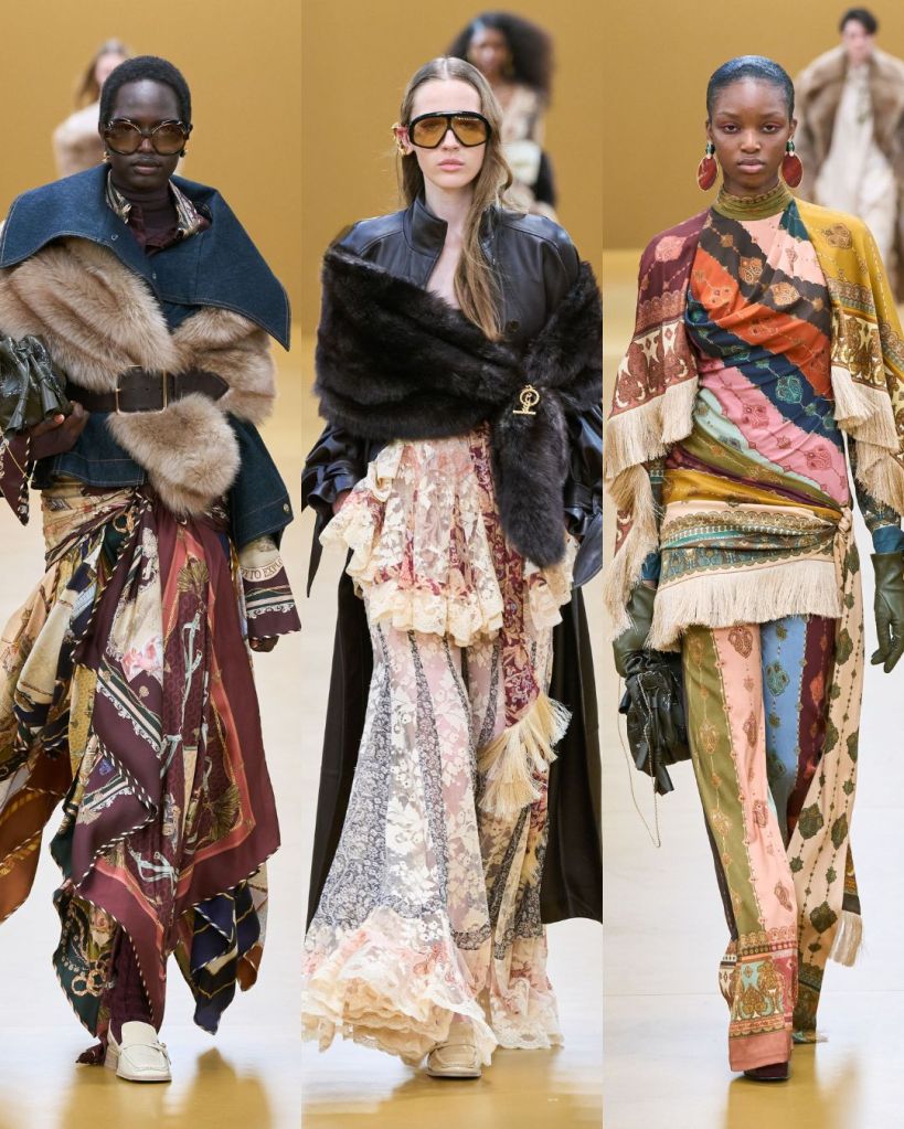 The opening look set the tone. A dress constructed from silk scarves printed with vintage illustrations felt romantic and slightly adventurous. From there, the collection moved through lingerie inspired gowns layered with lace, cozy knitwear in autumn shades, and flared silhouettes paired with block heel loafers.