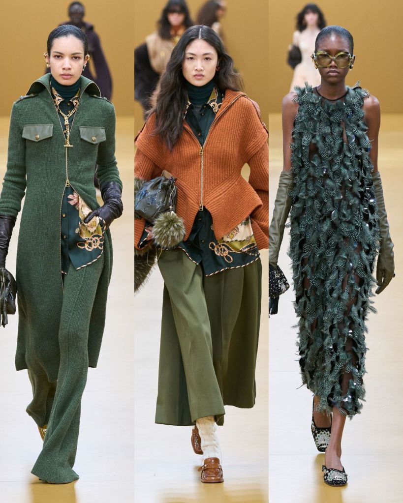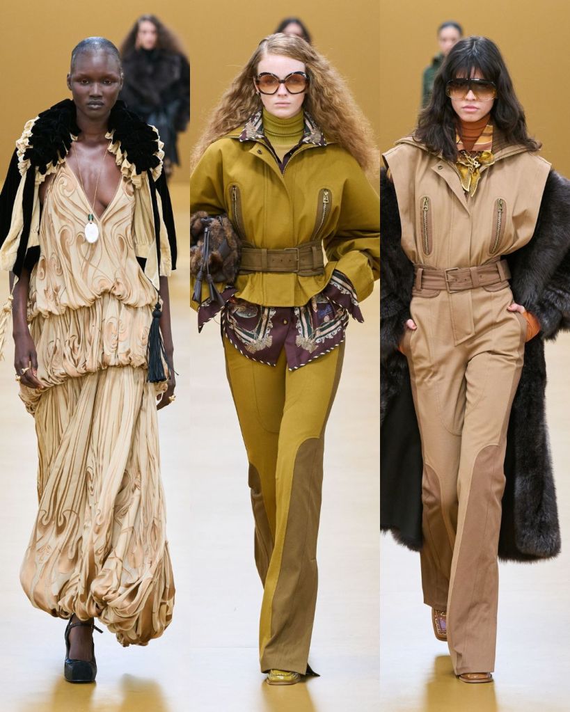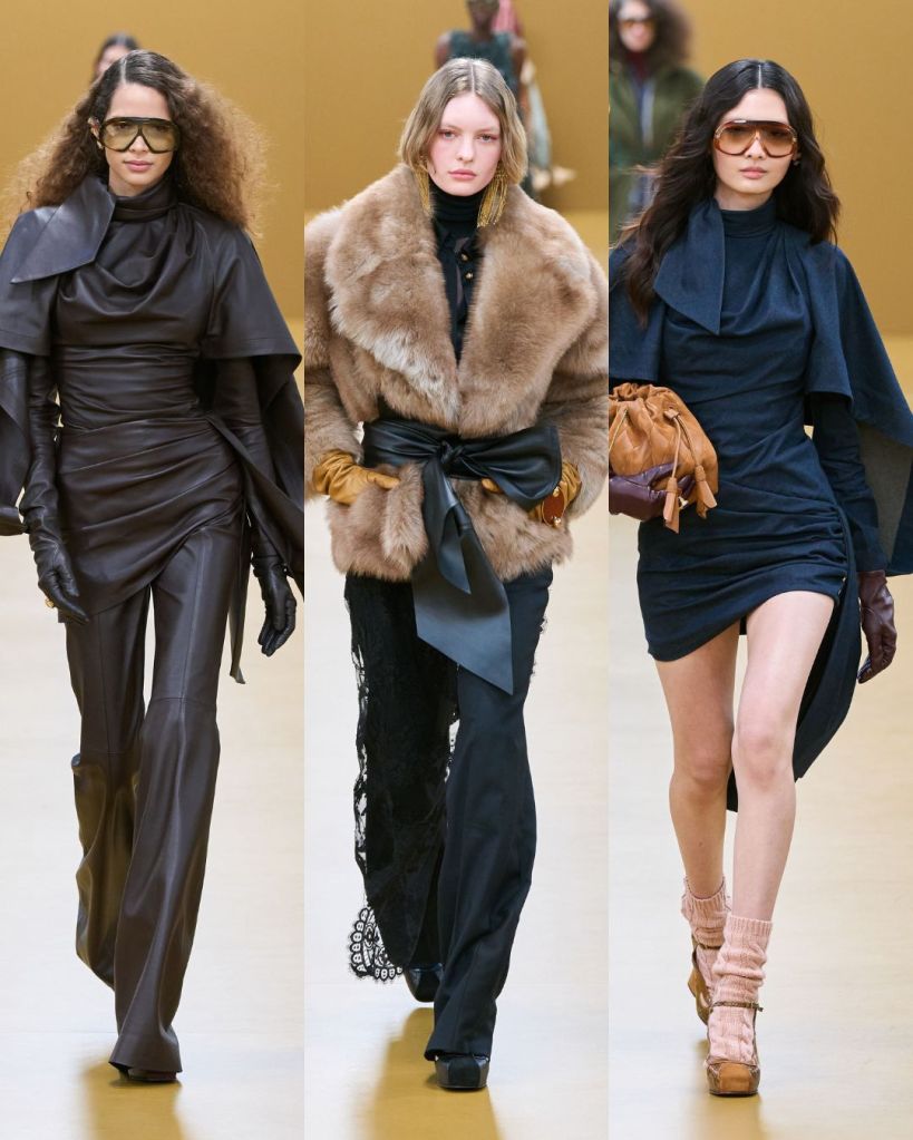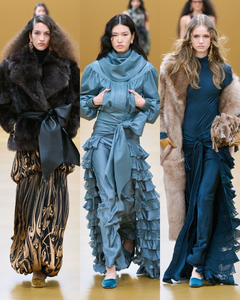 The opening look set the tone. A dress constructed from silk scarves printed with vintage illustrations felt romantic and slightly adventurous. From there, the collection moved through lingerie inspired gowns layered with lace, cozy knitwear in autumn shades, and flared silhouettes paired with block heel loafers.