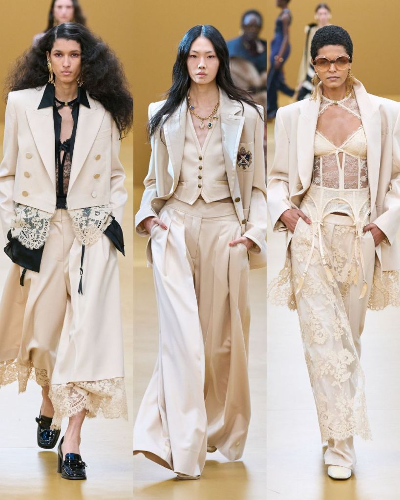 There were also subtle references to sportswear, including cricket inspired pieces with striped cotton skirts and knit jumpers. Tailoring appeared too, like a cropped champagne tuxedo jacket paired with lace detailed trousers that balanced softness with structure.