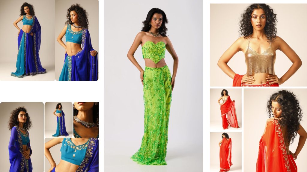 At the same time, the brand doesn’t feel exclusive in a limiting way. It’s positioned within the premium to couture space, but the emotional entry point feels broader. You can imagine a younger audience being drawn to the Indo-western pieces or lighter drapes, especially those who are navigating Indian wear through a more experimental lens. There’s a certain ease to these looks that aligns with how Gen Z is approaching occasion wear, less obligation, more personal expression.
